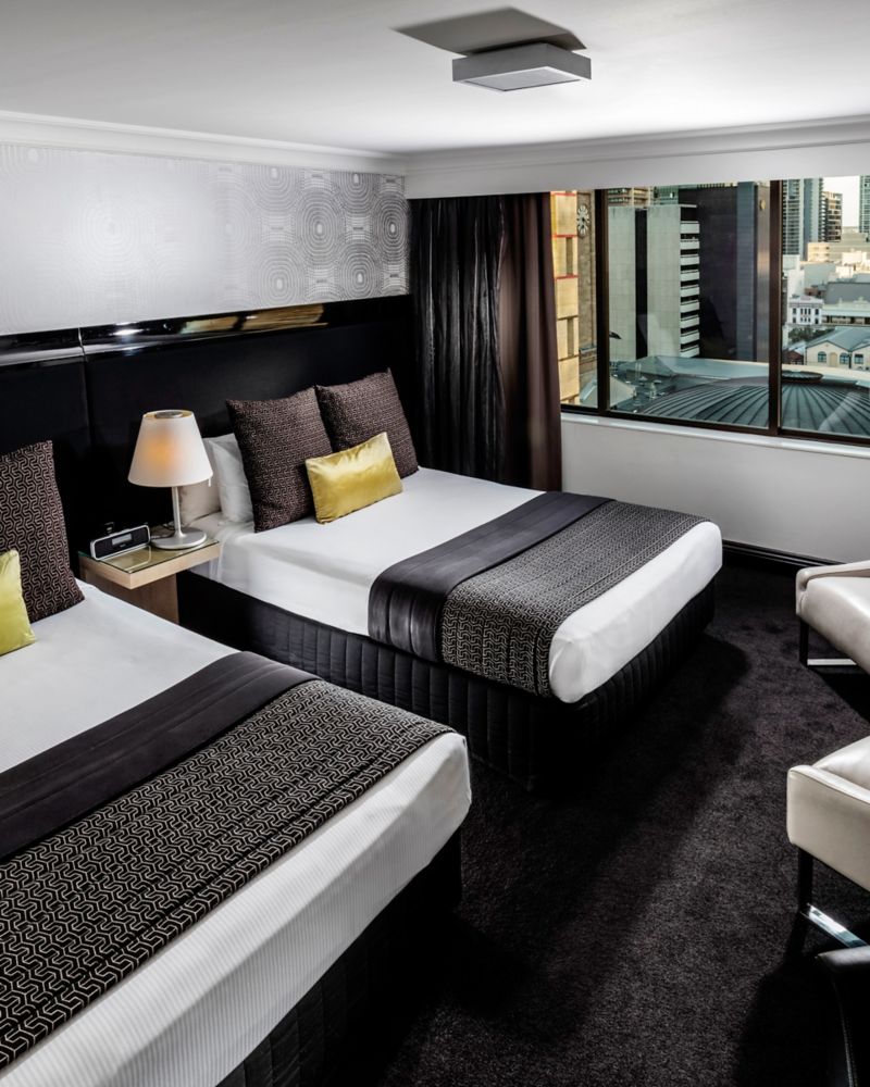 Spacious and modern rooms featuring two queen beds, marble finished ensuite with bath, shower and dual basins. Rooms feature LCD TV with Cable, separate work desk, wireless and cabled internet (fee), steam irons, ironing boards and bathrobes slippers