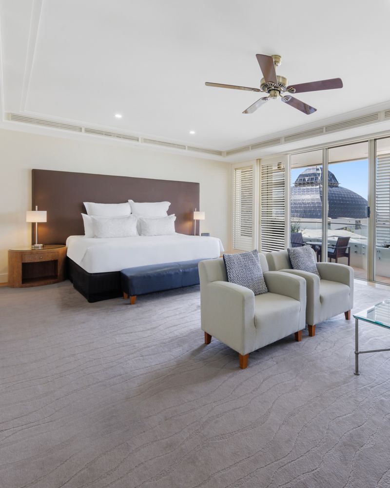 Appointed for comfort in warm, natural hues and all the modern conveniences you need. Our Deluxe Park View rooms are spaciously appointed with a king bed, single spa bath and private garden balcony.
