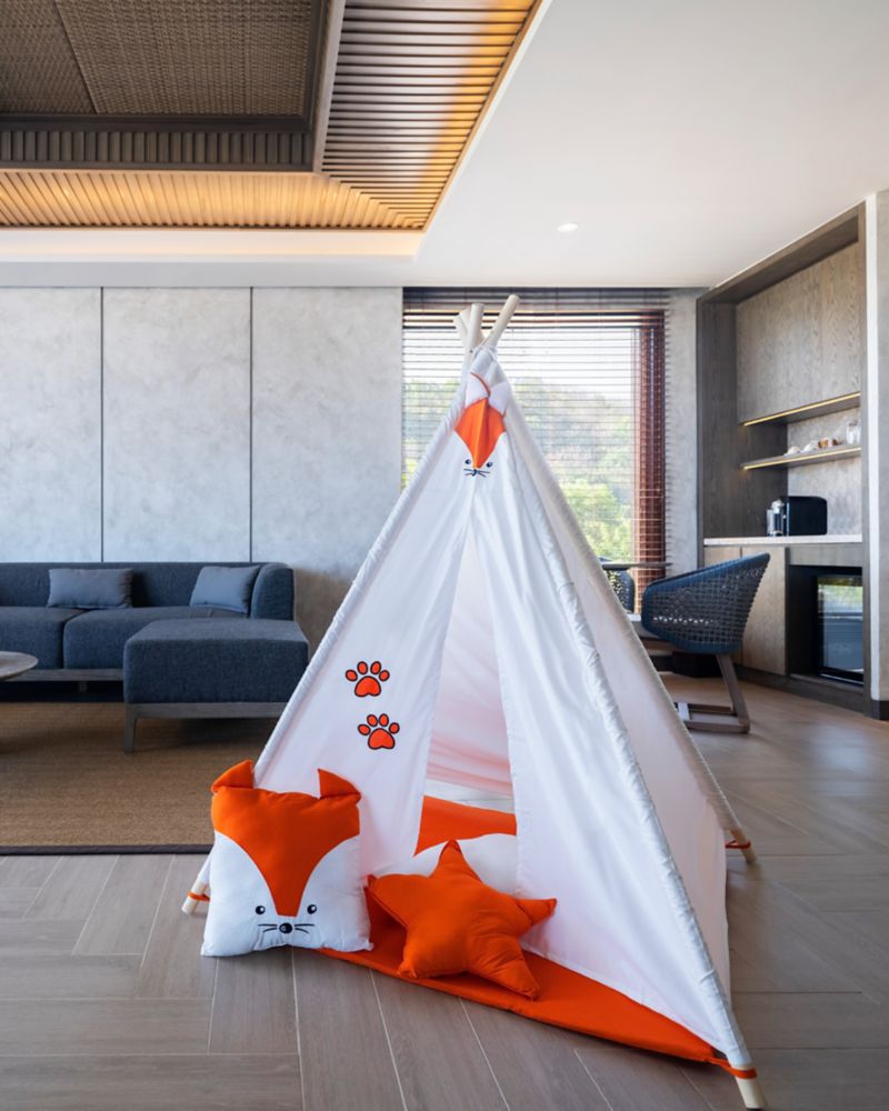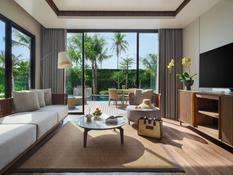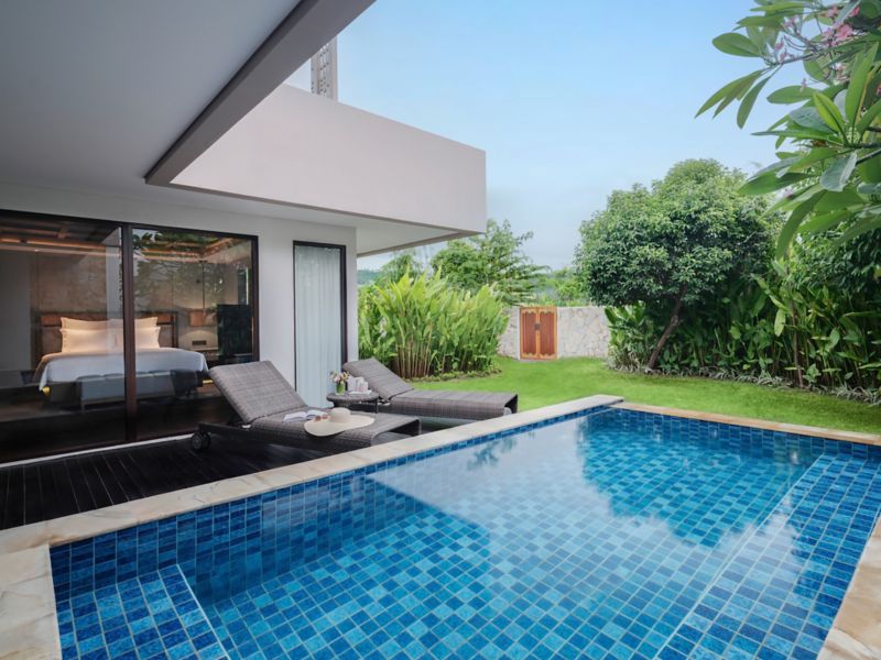 Premium 296sqm suite set in a spacious garden with seamless indoor and outdoor spaces. Open floor plan includes a living room with 1 king bed. Spacious ensuite with a large round bath and outdoor shower. Sundeck, plunge pool with expansive hillside views.