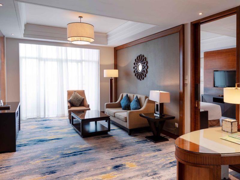 106 m²/1139 ft² rooms on floors 5 to 12, with private balcony, Pullman bedding, writing desk, complimentary WiFi, bluetooth speaker and wireless charger, minibar, separate shower and bathtub