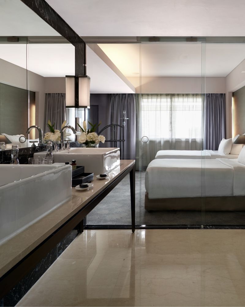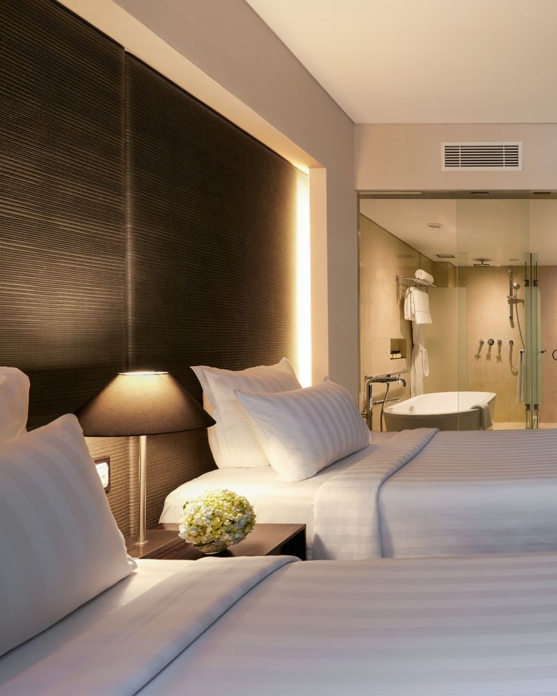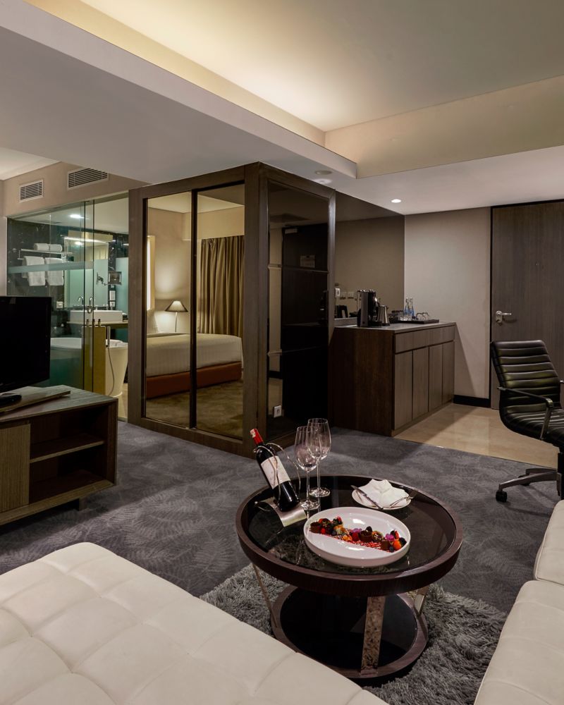 Modern 39 m² room in Jakarta's CBD featuring sofa lounge and ergonomic work desk. Enjoy an elegant raised bath and separate tranquil rain shower. Complimentary WiFi internet.