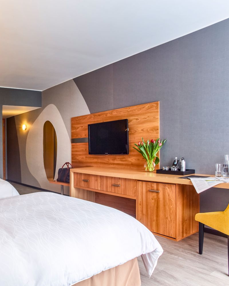 Spacious and cozy rooms. 32 m² room, 2 double beds, free WIFI, private bathroom, flat-screen TV, AC, desk, safe. Accessible and adapted to people with disabilities. Non-smoking room.