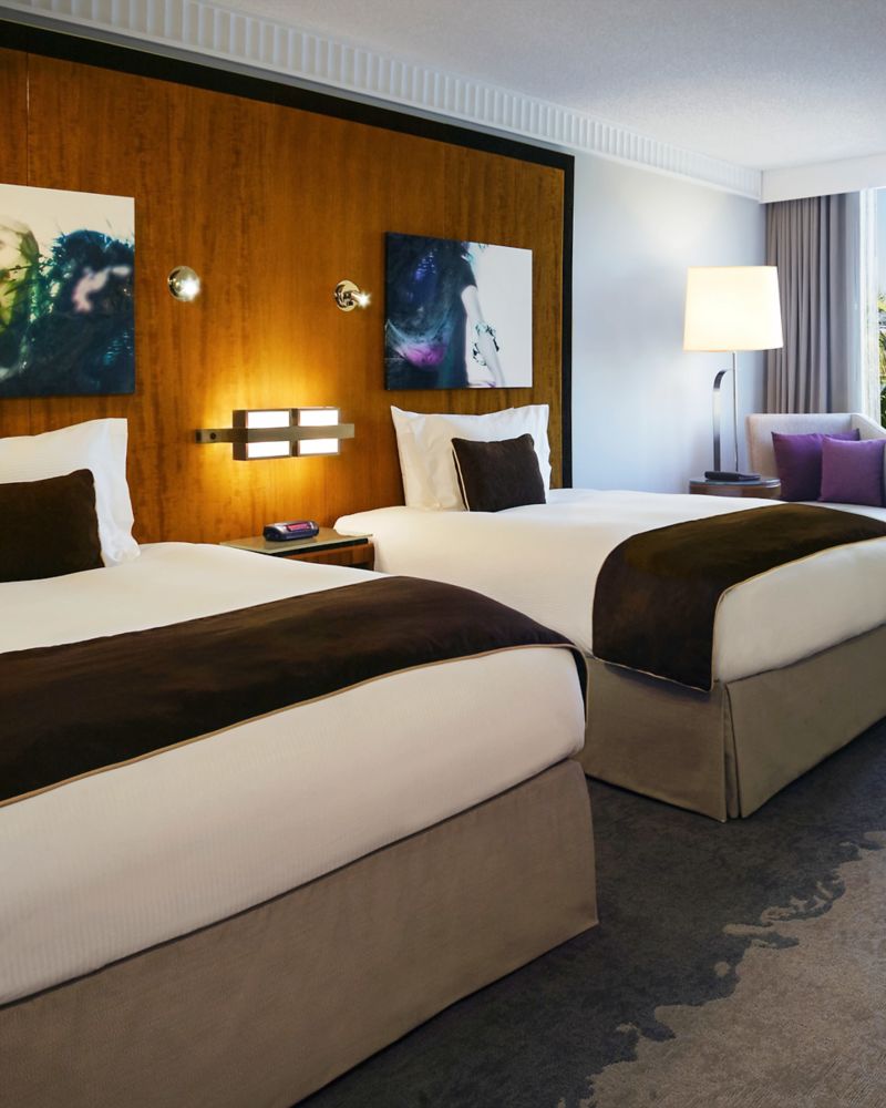 A 325 sq. ft. (30 m²) elegantly appointed room with a premium view, free WiFi, Keurig coffee, refrigerator, working area, two full-size beds with duvet. Complimentary bottled water on arrival, C.O. Bigelow amenities and iron/ironing board.