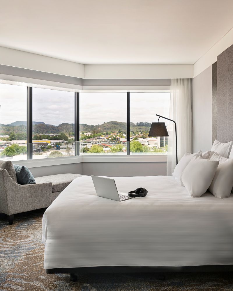 33 SQM. Experience style and comfort in an upscale room with views of Lake Rotorua .The room features a 50" Smart TV, wifi, mini bar, chaise lounge, rain shower, C.O. Bigelow bath amenities and pillow menu.
