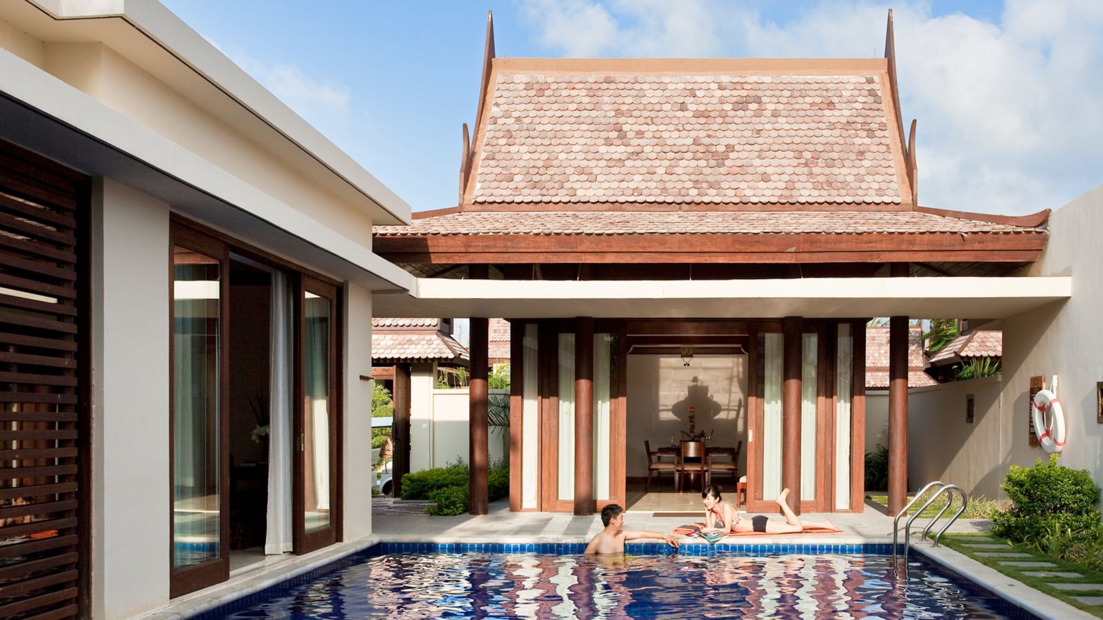 270 m² Thai-style family bungalow with living room, two King-size beds, 200×100 cm-wide Luohan Bed, bathroom, minibar, Flat Screen TV, free WIFI, and private exotic garden with swimming pool.