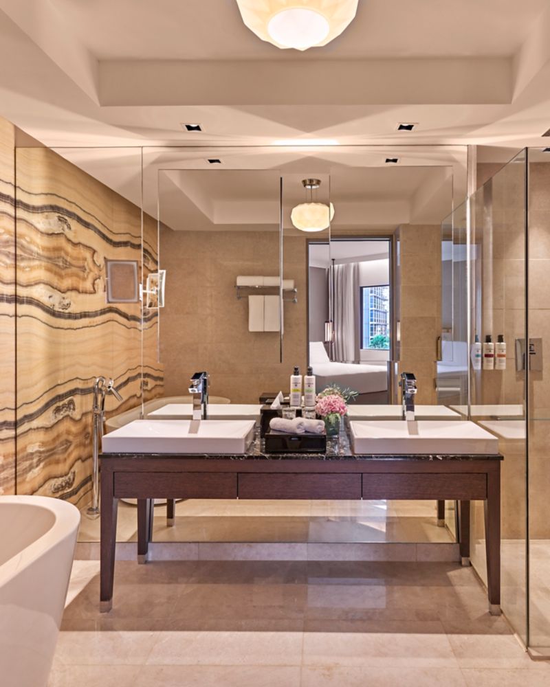 انعم براحة معاصرة في غرفة مميزة مستوحاة من أحدث التقنيات والمُزودة بتلفزيون ذكي وشاشة عرض ودُش مطري منعش وماكينة عمل قهوة نسبريسو وشاي عطري فاخر ومياه مفلترة ومستلزمات استحمام من C.O Bigelow وخدمة WiFi مجانية