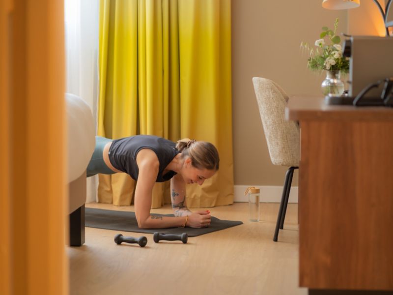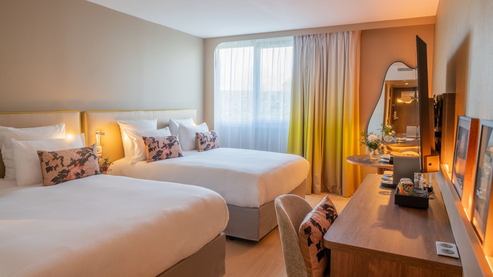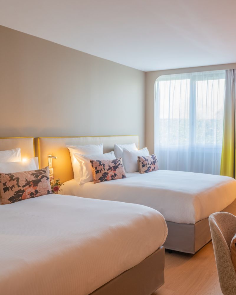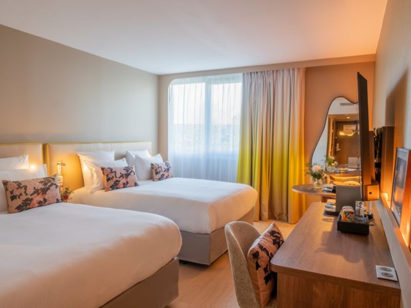 Spacious room of 300 sq.ft. with 2 comfortable beds, 55" TV, desk, tea, coffee machine, safe. Bathroom with walk-in shower and upscale products. Slippers and bathrobes. Access to the pool, fitness center and tennis court