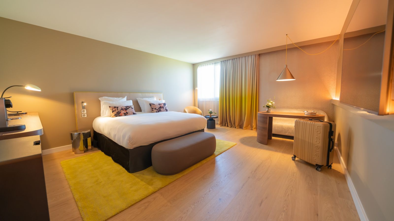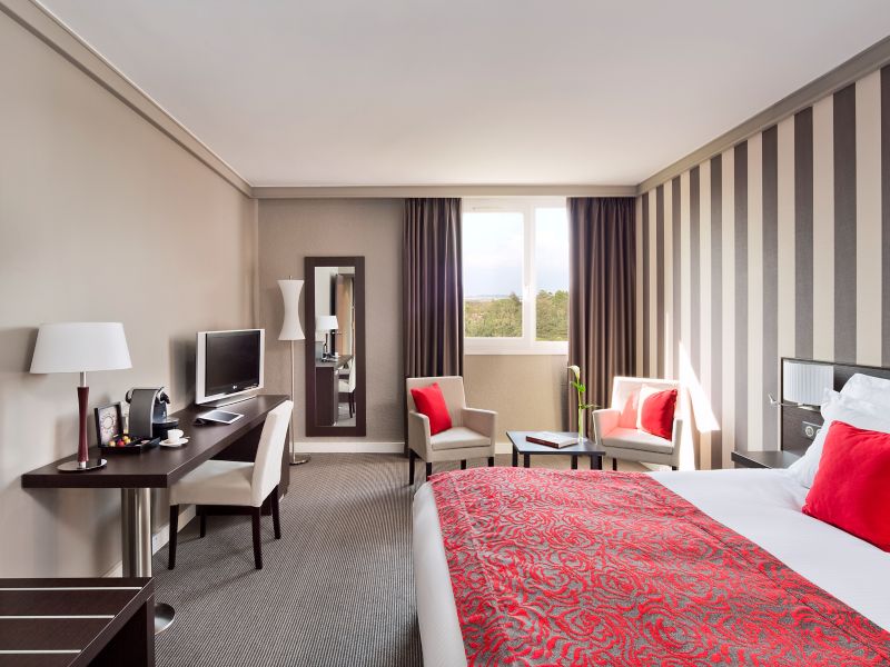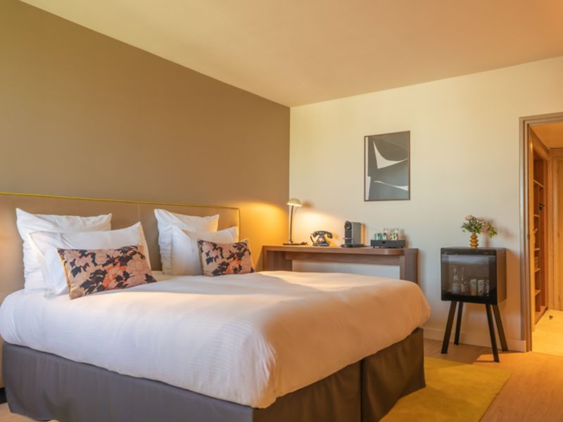 Modern room of 236 sq.ft. with double bed, 55" TV, desk, tea and coffee, safe. Bathroom with walk-in shower and quality products. Stylish armchair. Access to the pool, fitness center and tennis court.