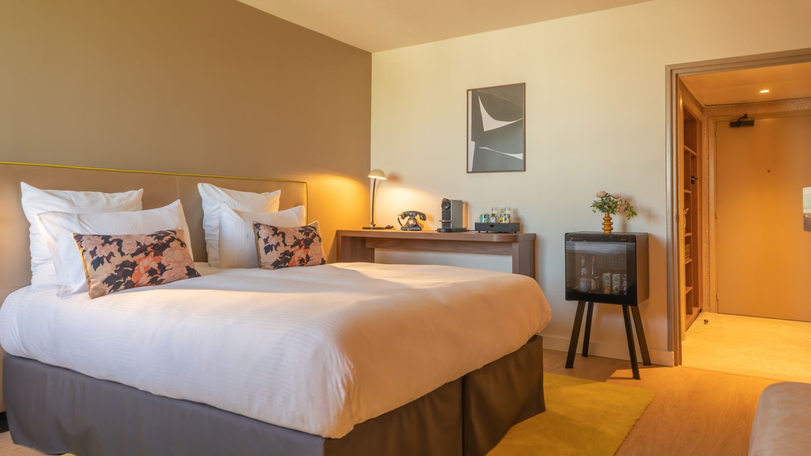 Elegant room of 300 sq.ft. with king-size bed, 55" TV, desk, tea, premium coffee machine, safe. Bright bathroom with walk-in shower and exceptional products. Slippers, bathrobes. Mini-bar, pool, fitness center and tennis court included