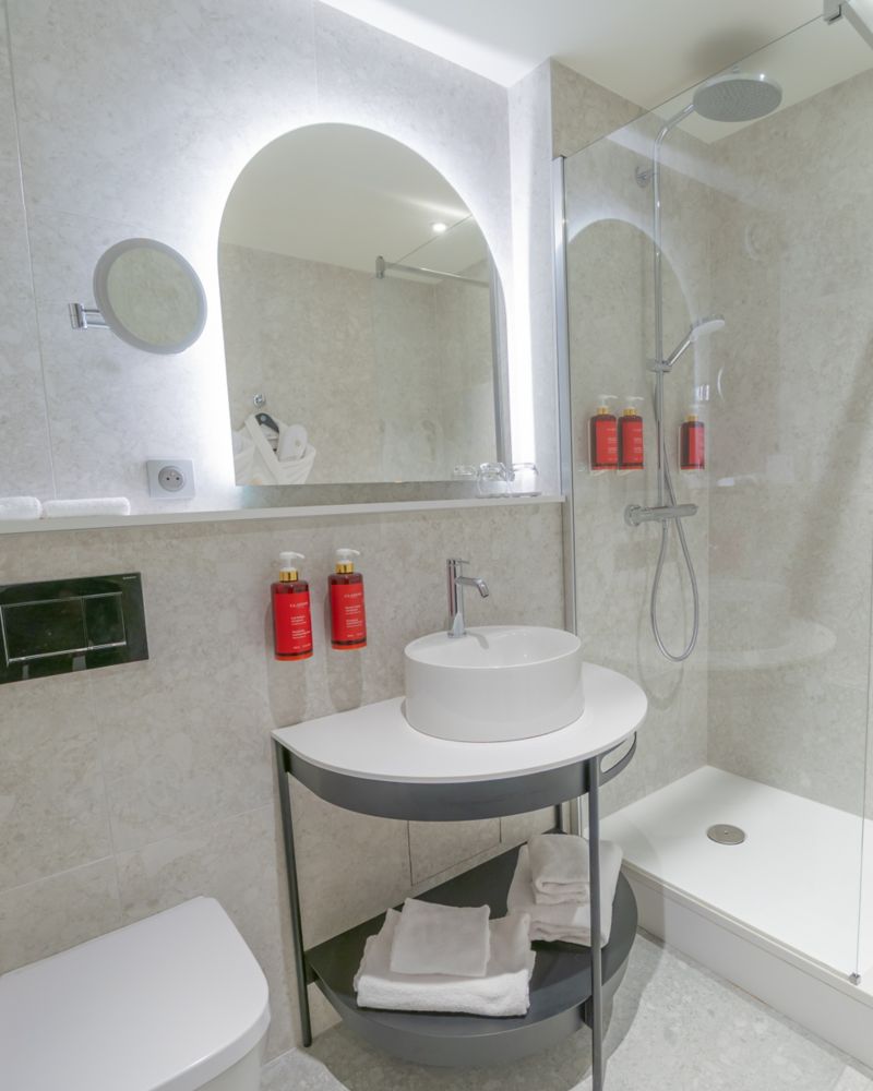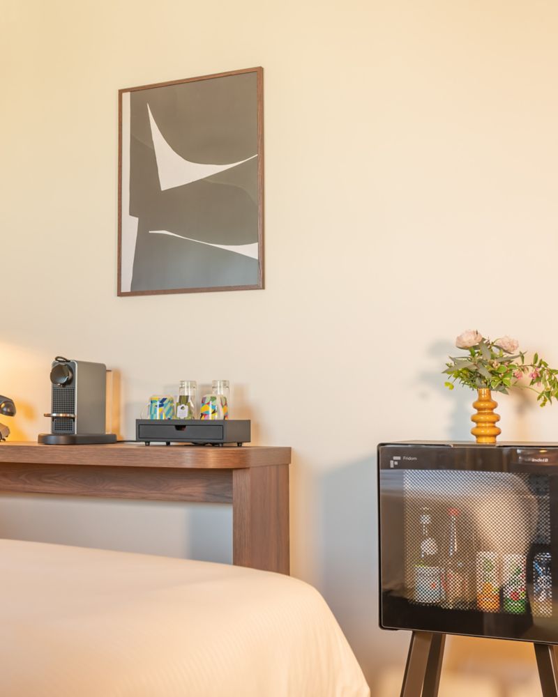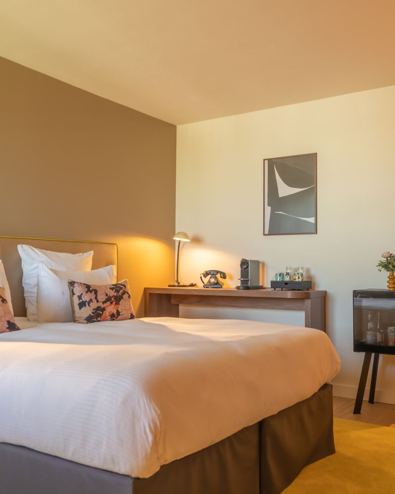 Modern room of 236 sq.ft. with double bed, 55" TV, desk, tea and coffee, safe. Bathroom with walk-in shower and quality products. Stylish armchair. Access to the pool, fitness center and tennis court.