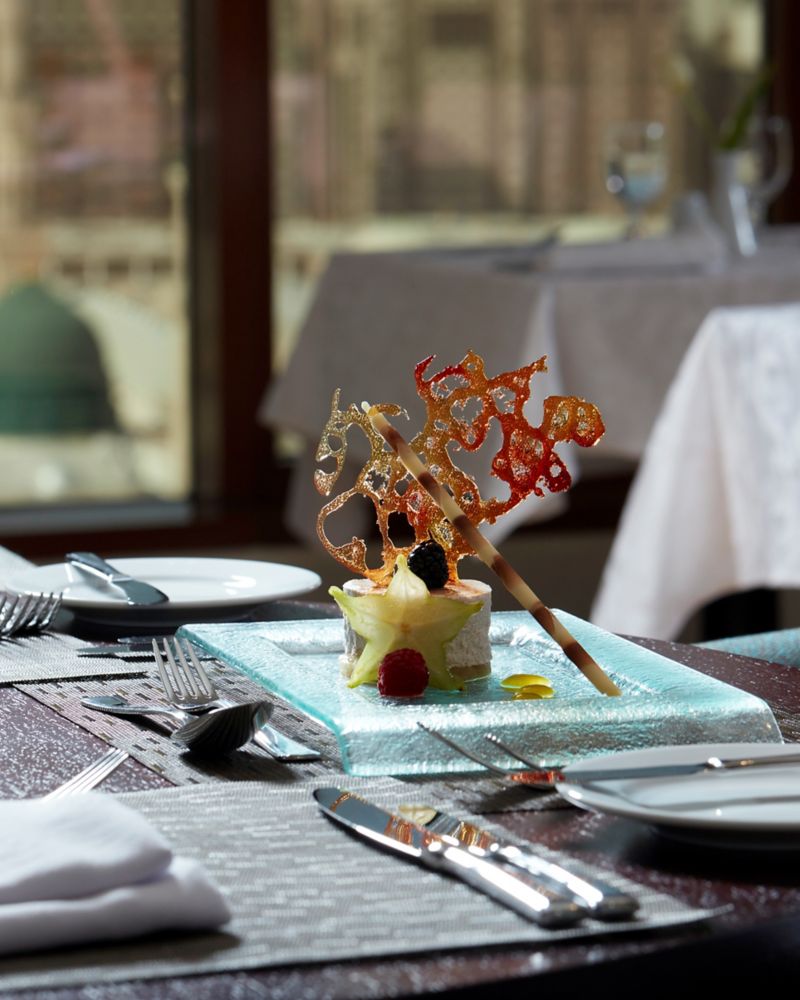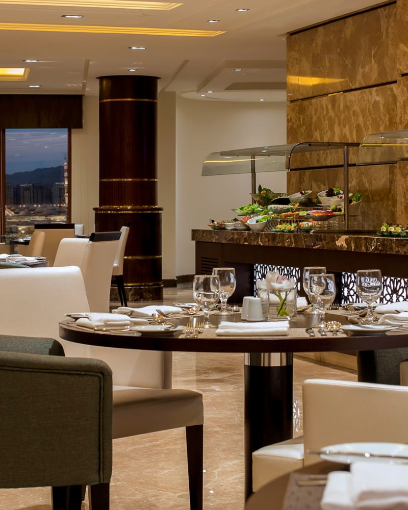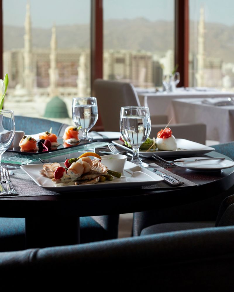 Internationale kulinarische Köstlichkeiten zum Frühstück, Mittag- und Abendessen in Büfettform, in orientalischem Ambiente, mit Blick auf die Moschee des Propheten (PBUH). Das Menü à la carte bietet orientalische Spezialitäten zum Mittag- und Abendessen.
