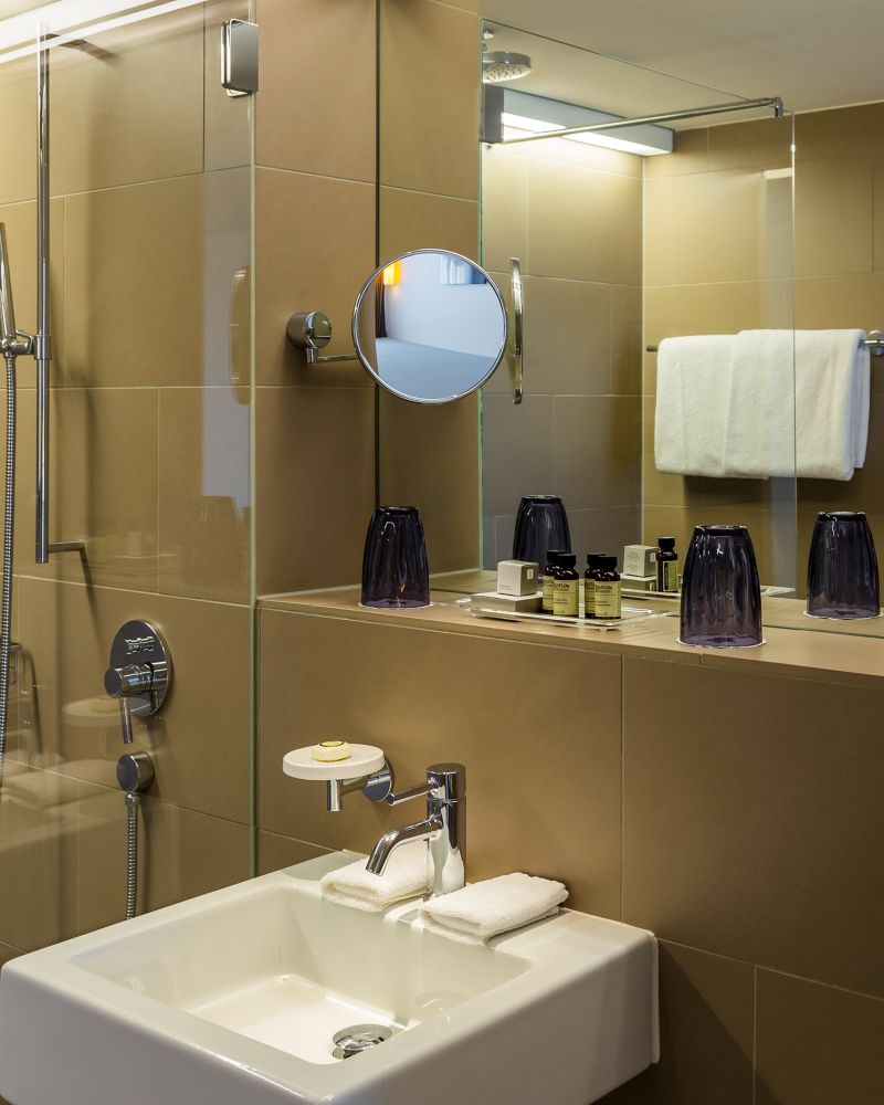 Dezent designtes Classic Zimmer (19 - 23 m2), klimatisiert und mit Garten- oder Stadtblick, großem Fenster, komfortablem Pullman Bett, gratis Internet, LED TV, Multimedia-System, Safe, Schreibtisch, Nespresso Maschine, Minibar und Regendusche.
