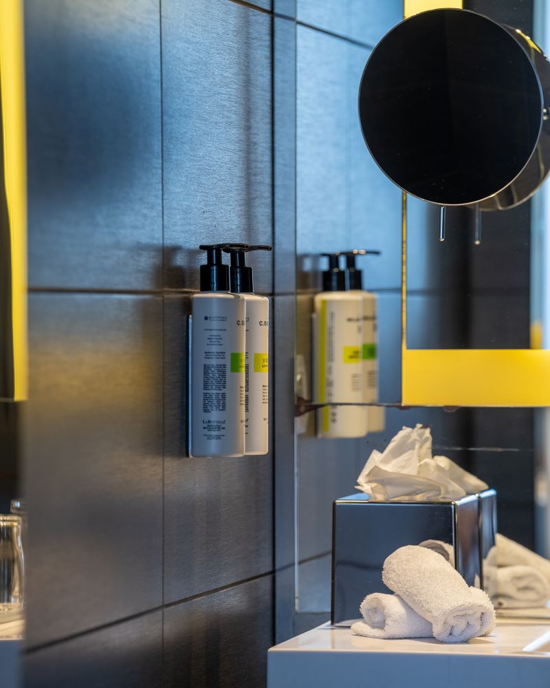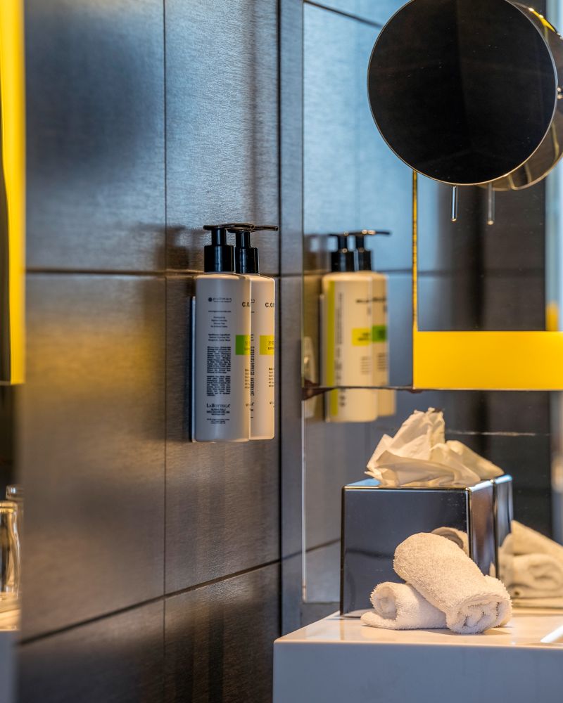 26 m²-Zimmer, kostenloses WIFI, Chromecast-TV, Nespresso-Kaffeemaschine, Klimaanlage, kostenlose Minibar m. stillem Wasser u. Sprudel, Bose-Dockingstation, Bad m. Regendusche oder Badewanne (auf Anfrage), Haartrockner u. separate Toilette
