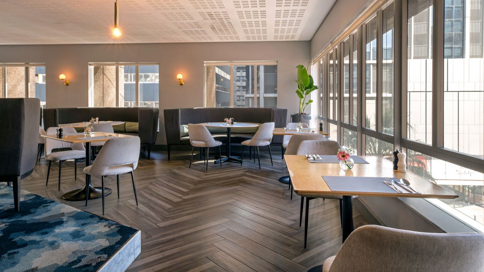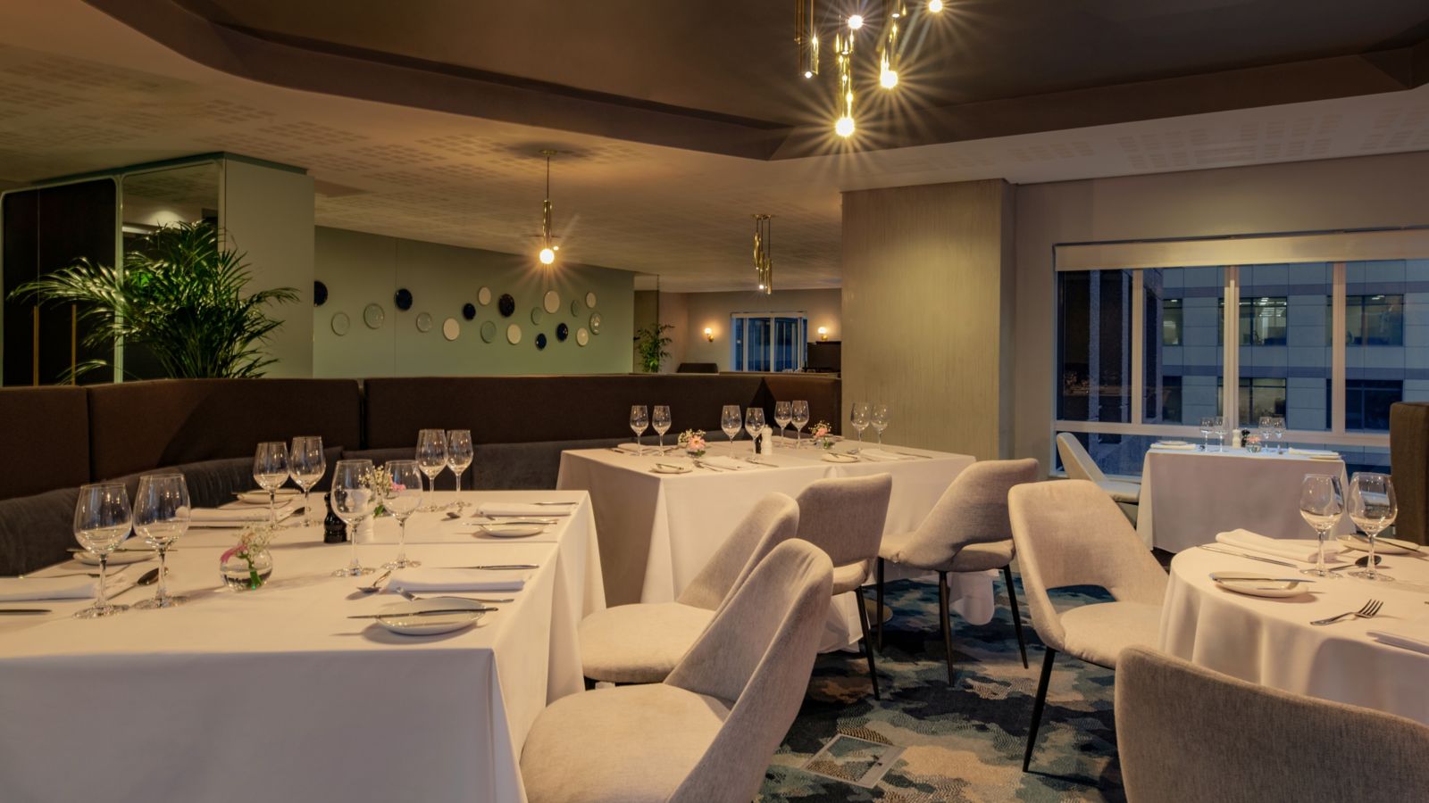 Der Stratus Room mit Blick über die Straßen der Stadt strahlt Eleganz und Raffinesse aus. Das stilvolle, sonnige, luftige Ambiente ist ideal, um mit Freunden oder der Familie ein köstliches Frühstücksbüfett zu genießen.