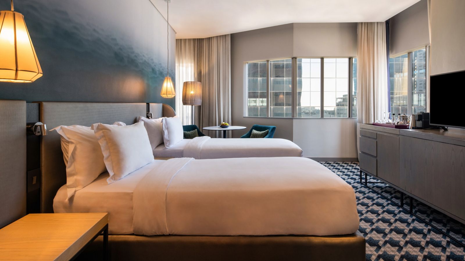 Das Classic-Twin-Zimmer ist eine 30 m2 große Oase mit zwei Twin-Betten, Stadtblick, USB-Anschlüssen, Minibar, Klimaanlage und WLAN. Ein modernes Bad mit begehbarer Dusche und durchdachten Extras macht es ideal für Freunde, Familien oder Kollegen.
