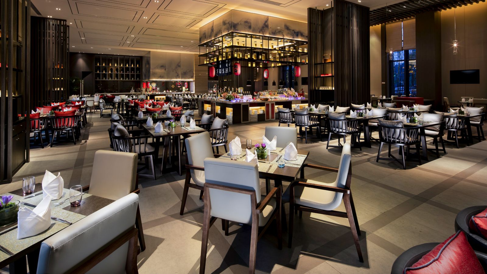 Das Restaurant bietet eine Auswahl an westlicher, asiatischer und japanischer Küche in einem entspannten Ambiente mit Blick auf den See.
