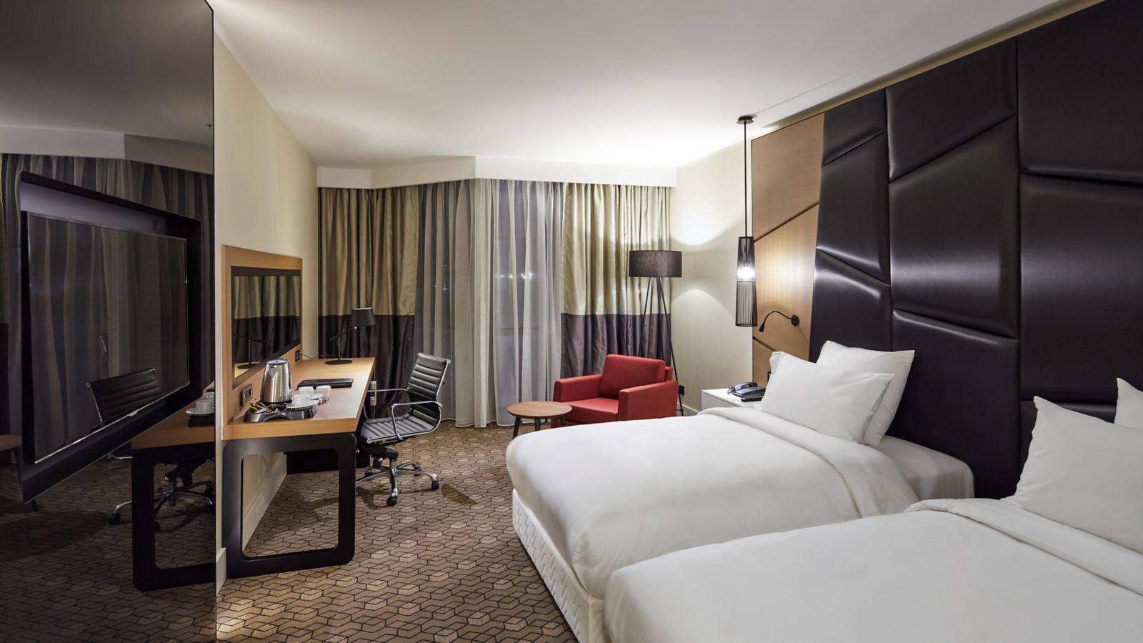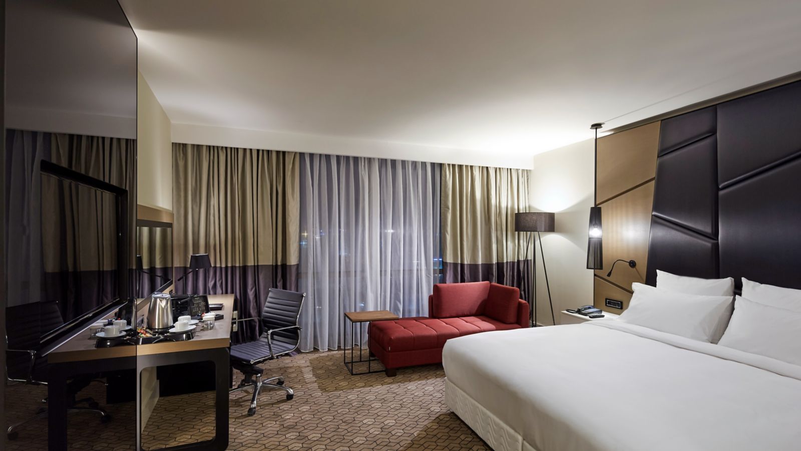 45 M² / 484 SQF Room, free WIFI internet access, spacious working desk, 40 inch LCD TV, mini bar, shower or bathtube, laptop-size safe, access to executive lounge. Non-smoking rooms available upon request
