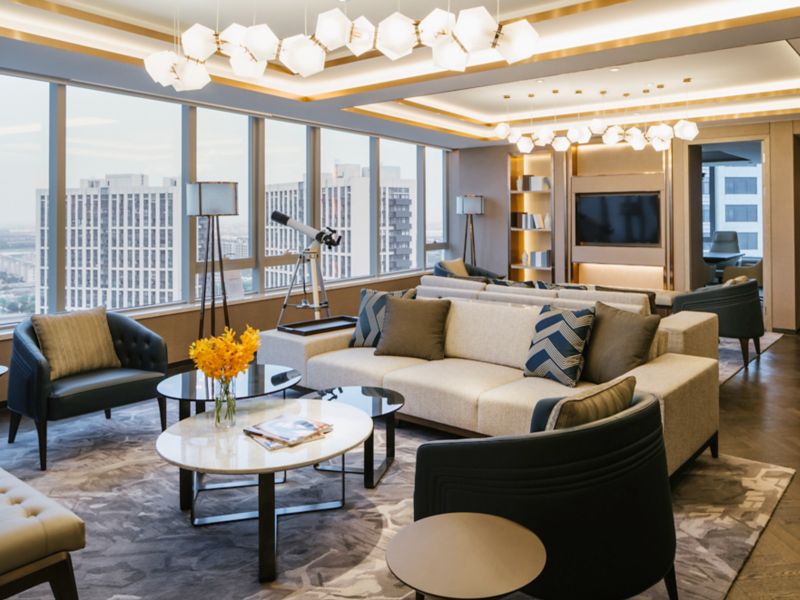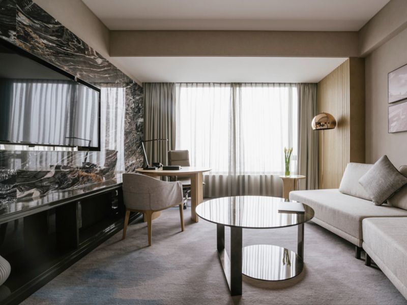 客房面积 74 平方米(796 平方英尺),位于酒店 5-23 层,带独立起居室,配备 55 英寸液晶电视、迷你酒吧、奈斯派索咖啡机、瑜伽垫、独立淋浴和浴缸、免费洗浴用品,以及行政休闲区权益。