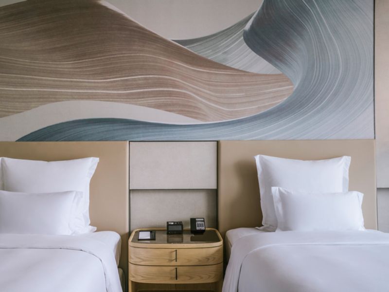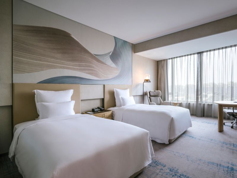 客房面积 34 平方米(365 平方英尺),位于酒店 5-10 层,配备 49 英寸液晶电视、迷你酒吧、免费无线网络、瑜伽垫、独立淋浴和浴缸、免费洗浴用品。