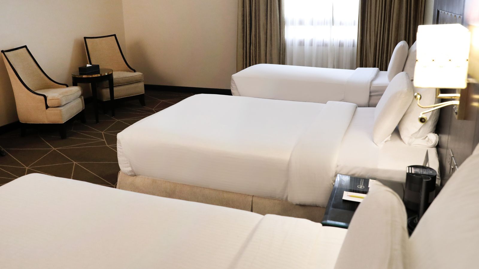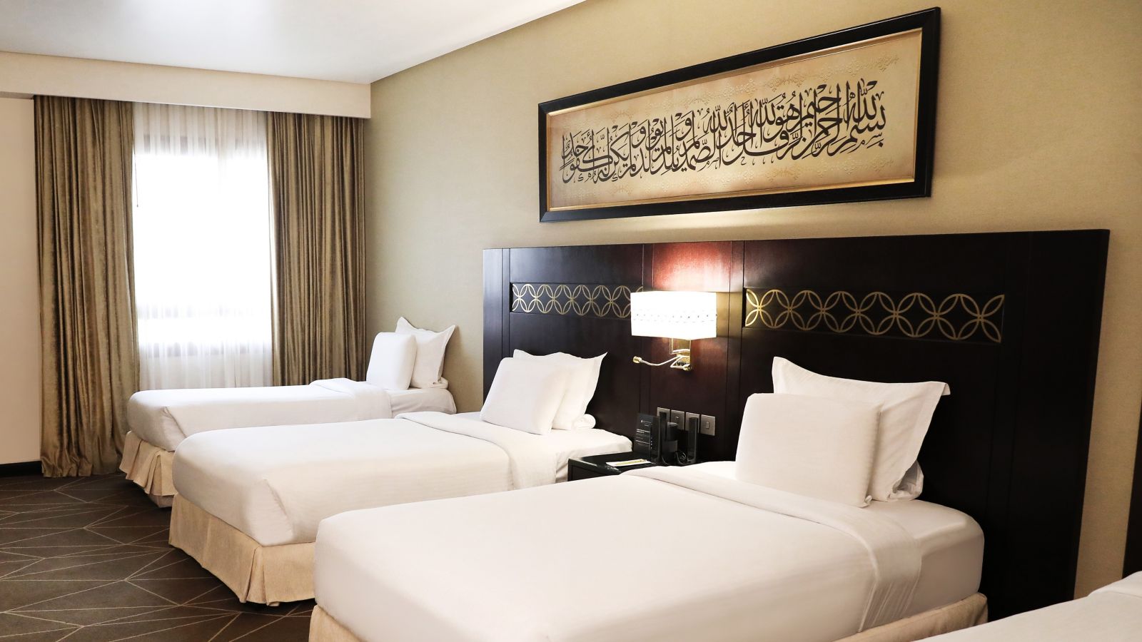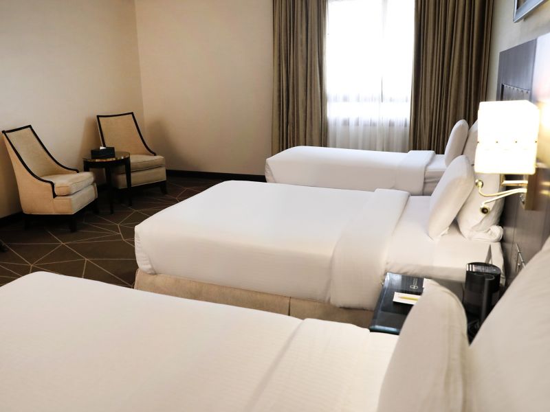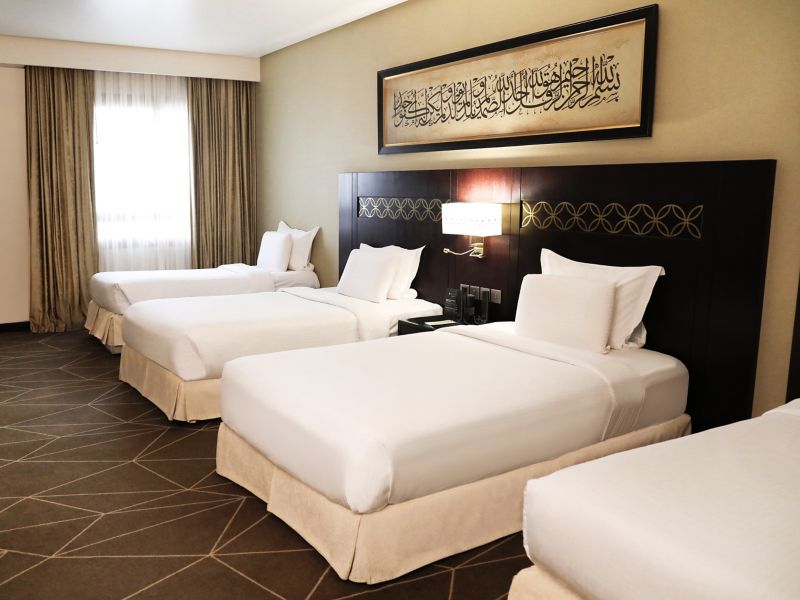 The 35 sqm room invites you to enjoy comfortable stay on Madina city view room 4 single beds. is equipped with 55" LED TV for your entertainment and for your convenience; we offer free internet, tea-coffee making facility and one bathroom with shower
