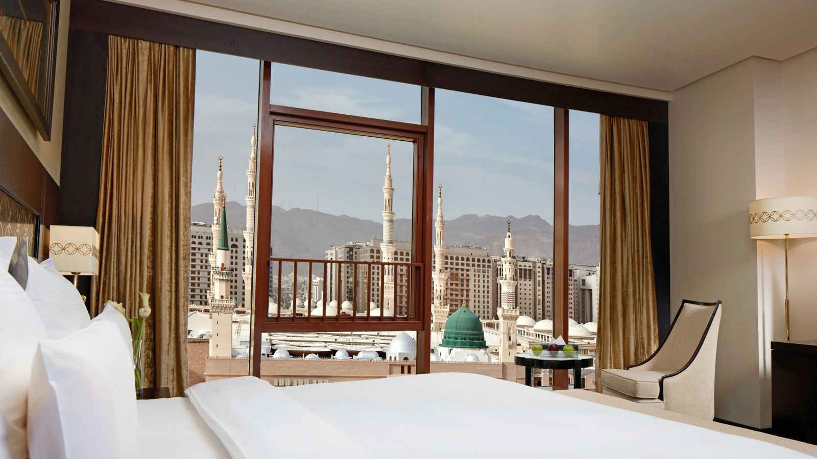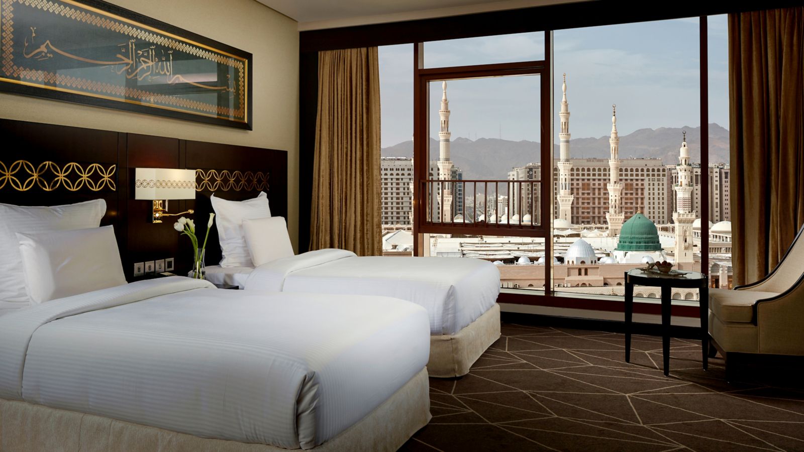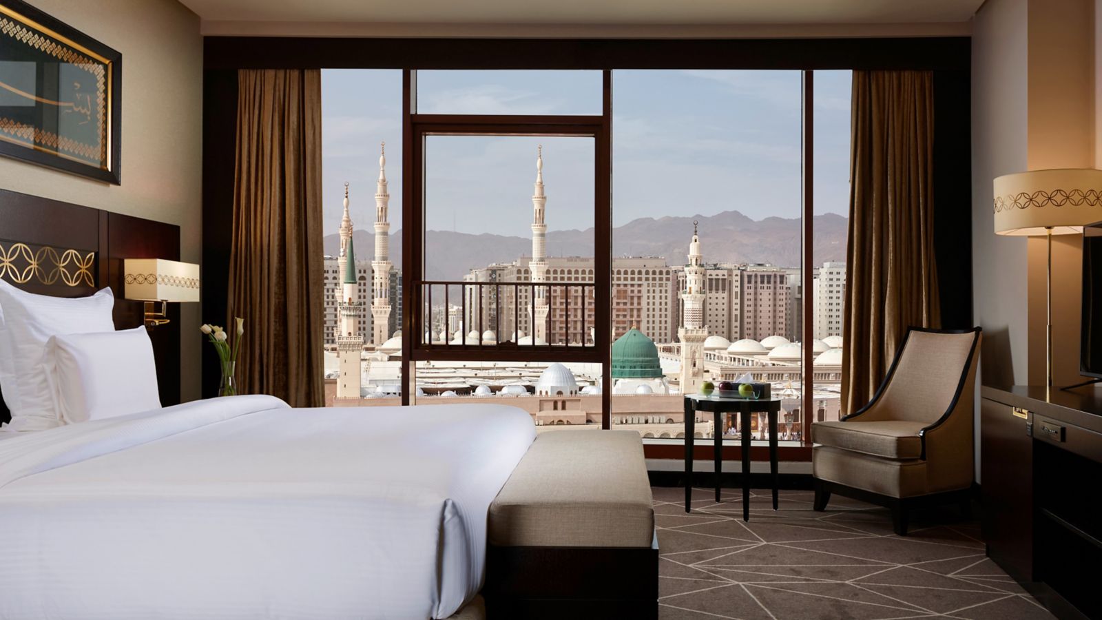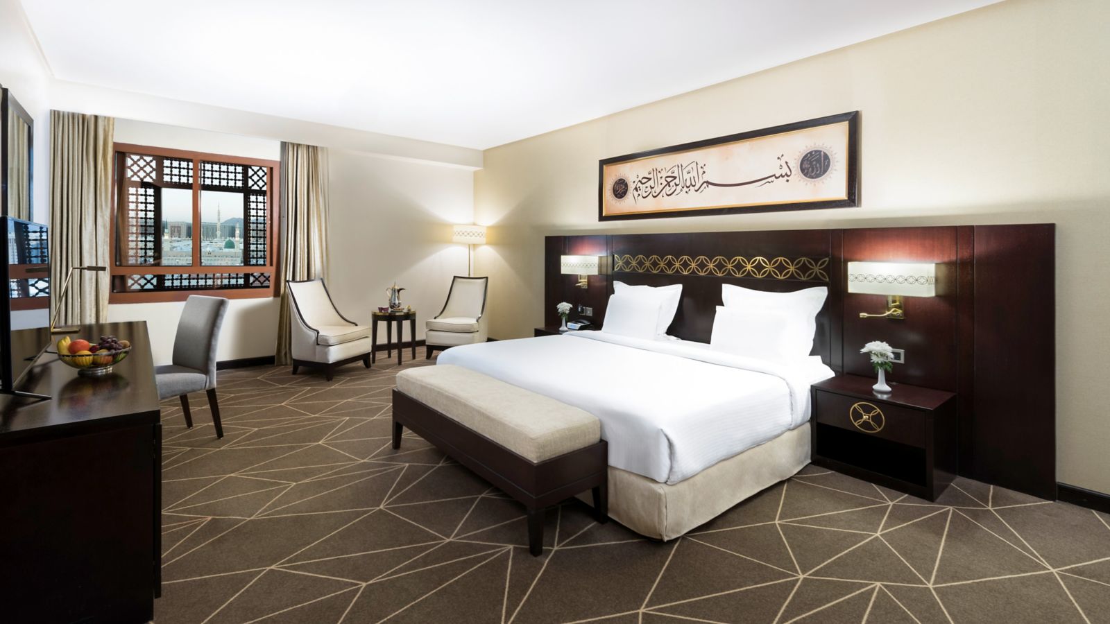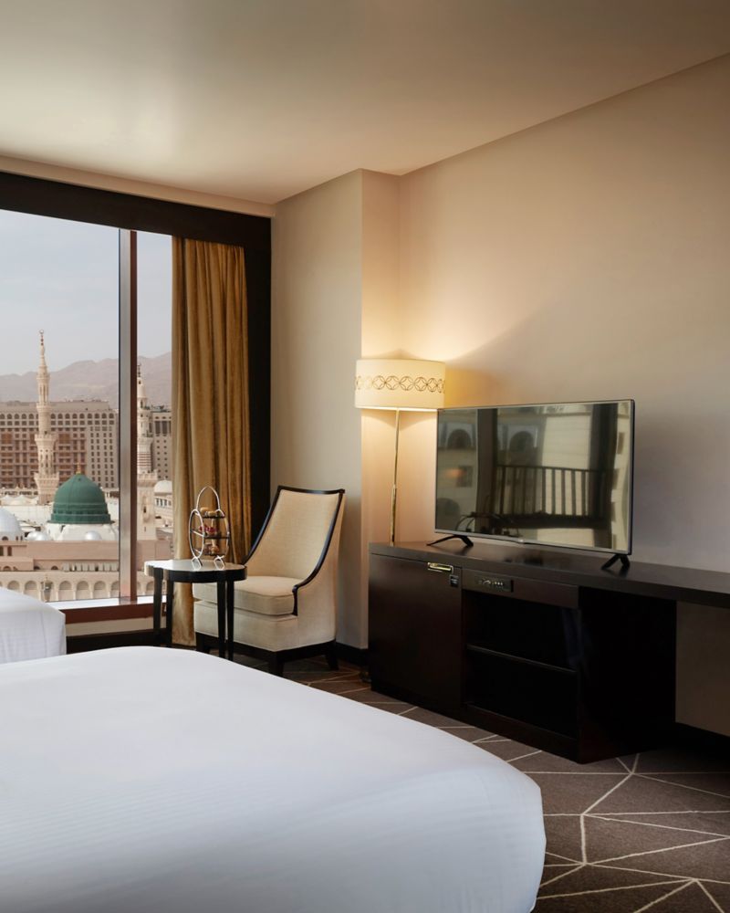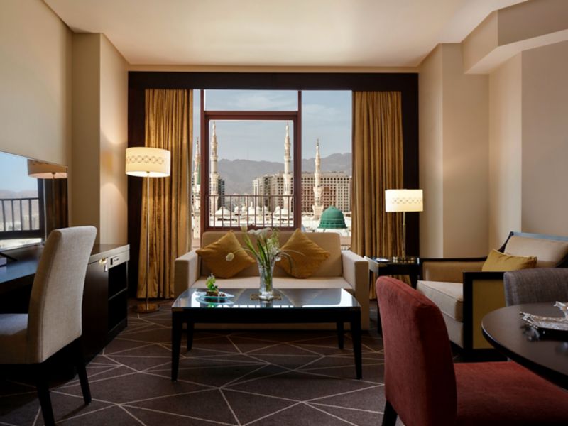 The 60 sqm suite offers an enchanting captivating bedroom designed for comfort overlooking the holy Madina city. The suite is provided with separate living room, free internet, sofa, two 55"LED TV and one bathroom with shower