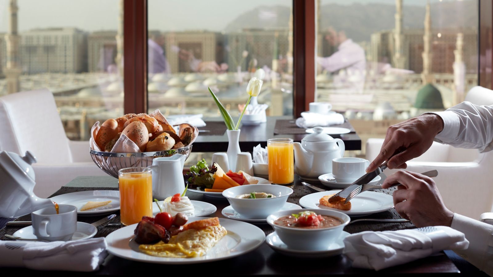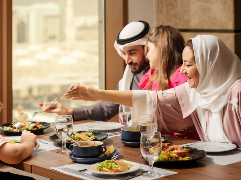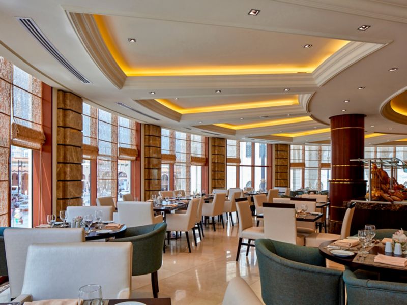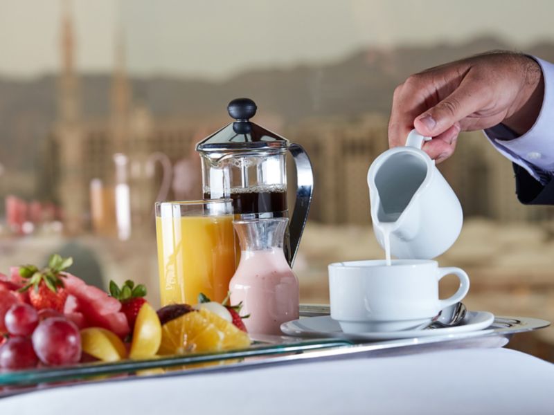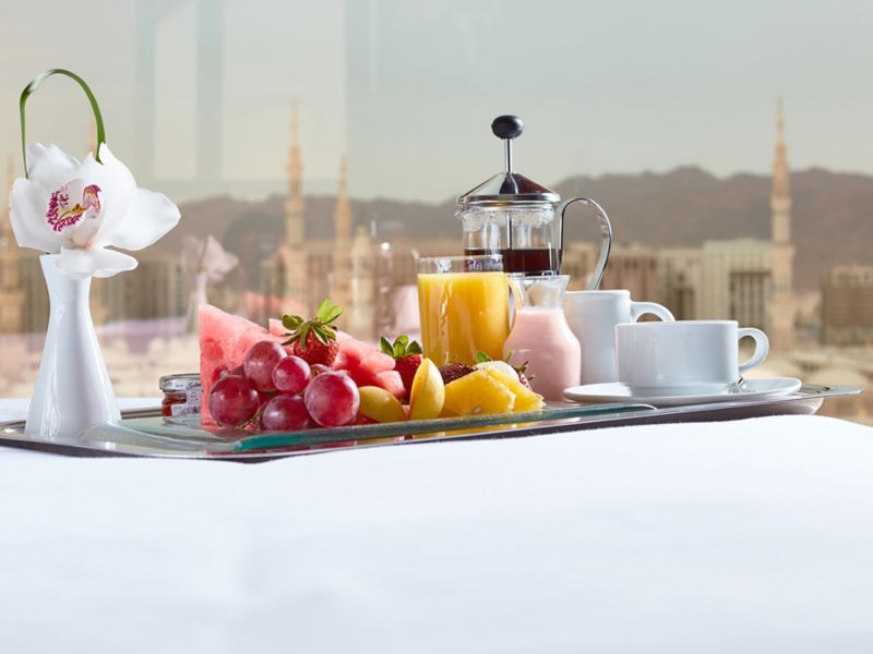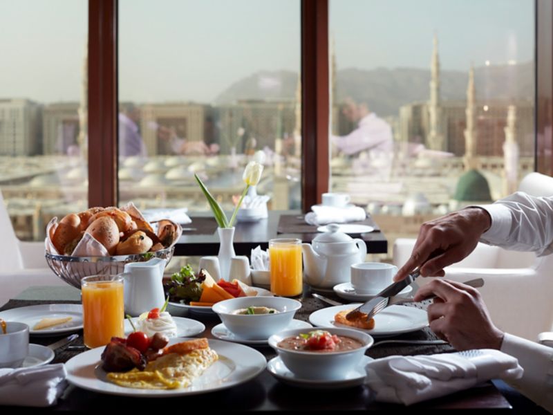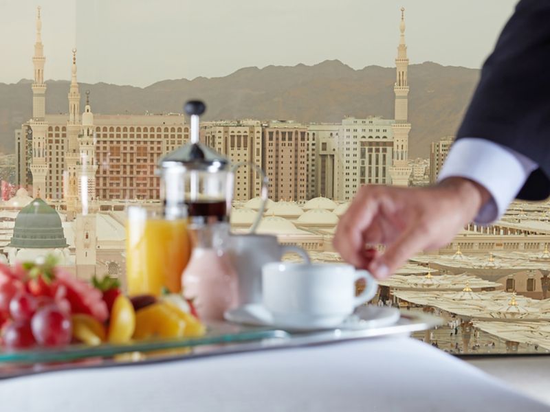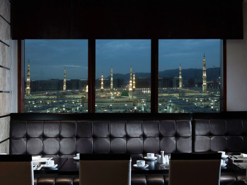 International culinary delights carved into breakfast, lunch, and dinner buffet, fused in oriental ambiance, with soulful aerial view overlooking the Prophet (PBUH) Mosque. Try the à la carte menu featuring fine Oriental specialties during lunch & dinner.