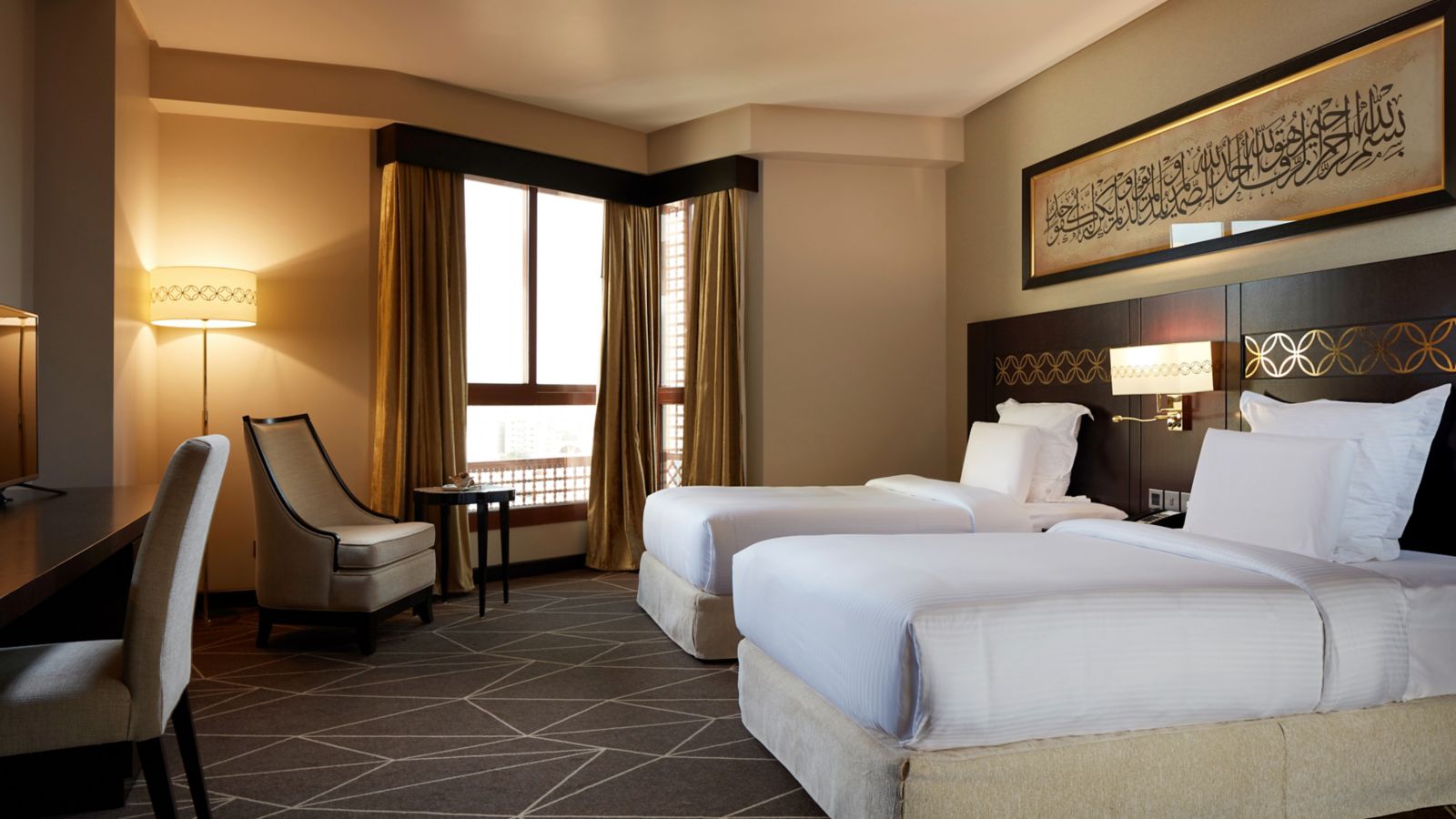 The 35 sqm room invites you to enjoy comfortable stay on Madina city view room. The room is equipped with 55" LED TV for your entertainment and for your convenience; we offer free internet, tea-coffee making facility and one bathroom with shower