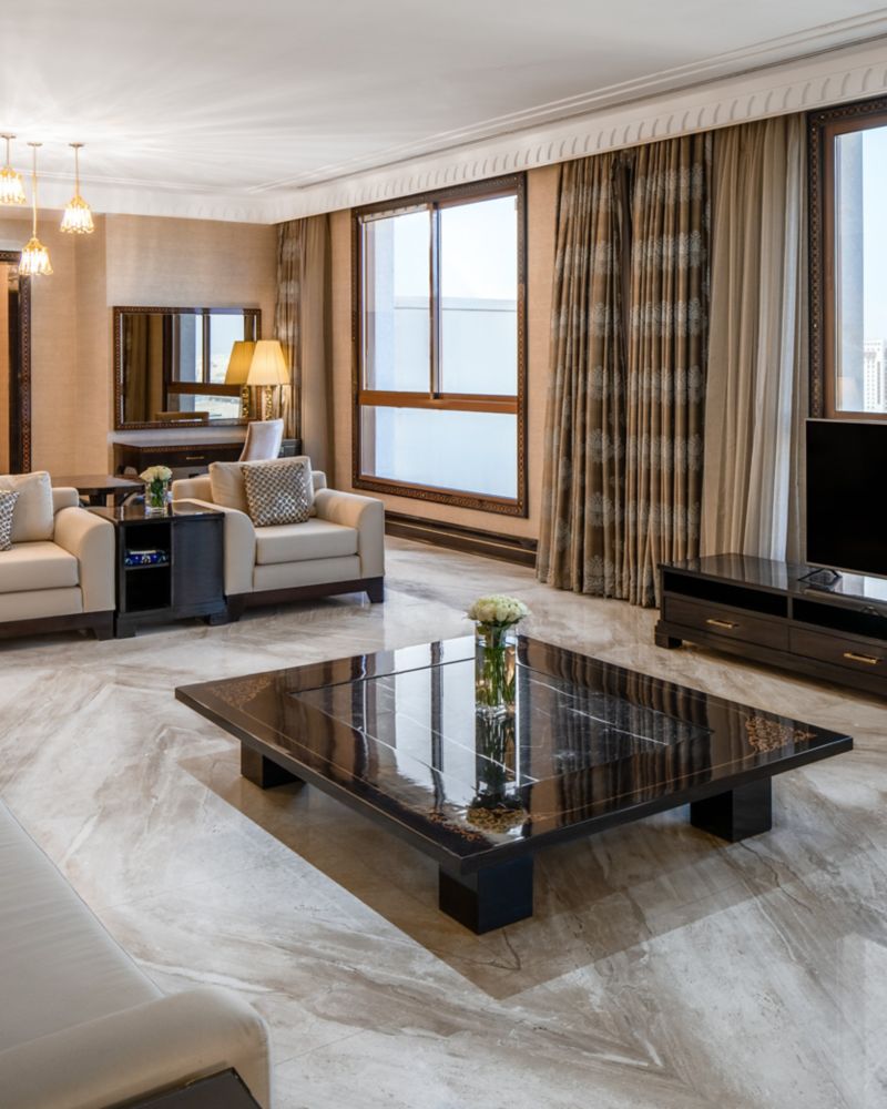 The 35 sqm room invites you to enjoy comfortable stay on Madina city view room. The room is equipped with 55" LED TV for your entertainment and for your convenience; we offer free internet, tea-coffee making facility and one bathroom with shower
