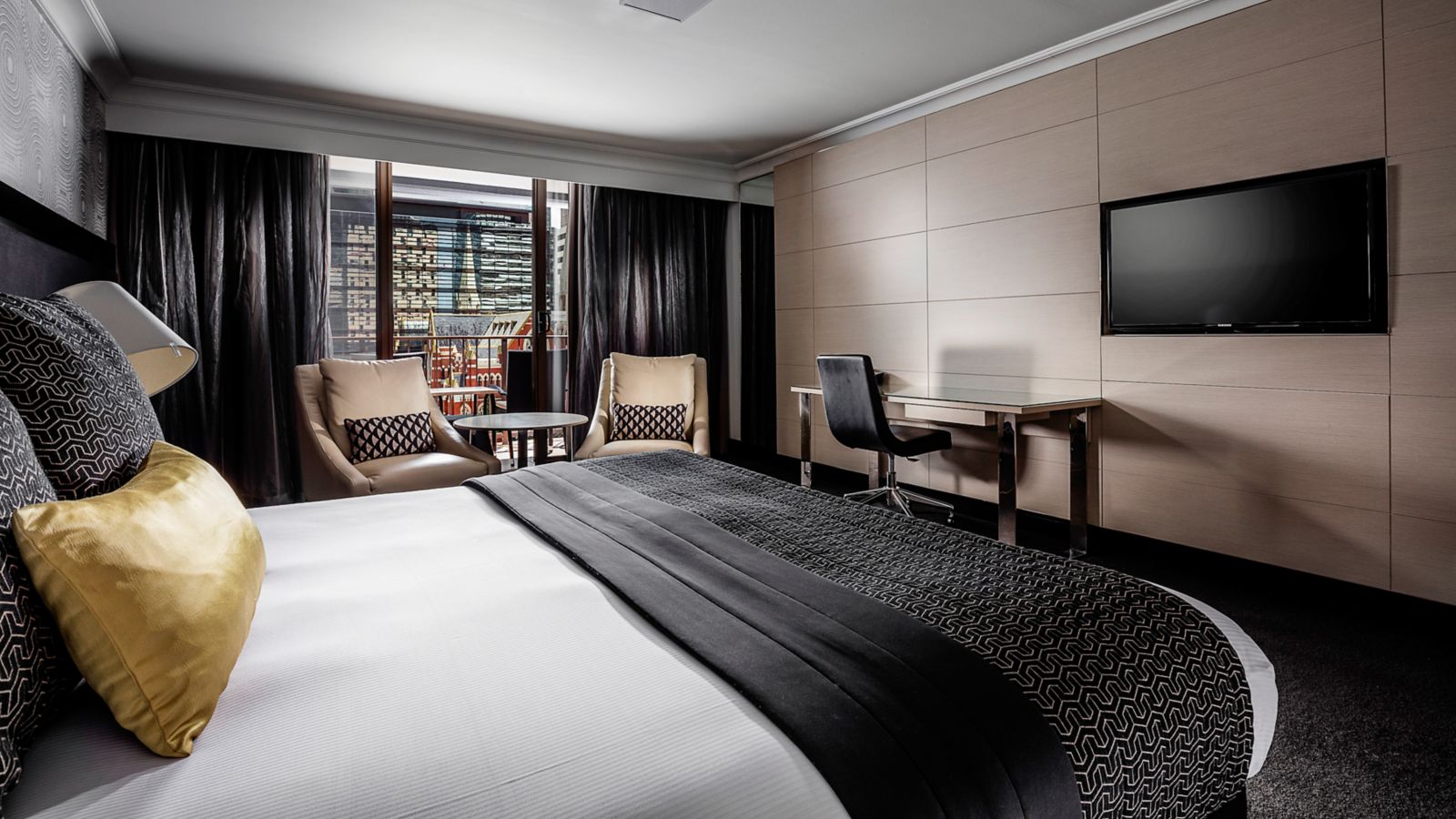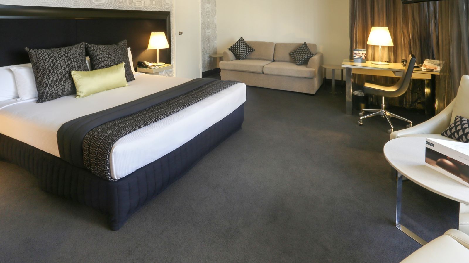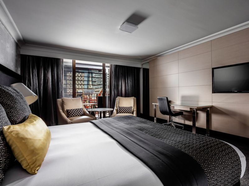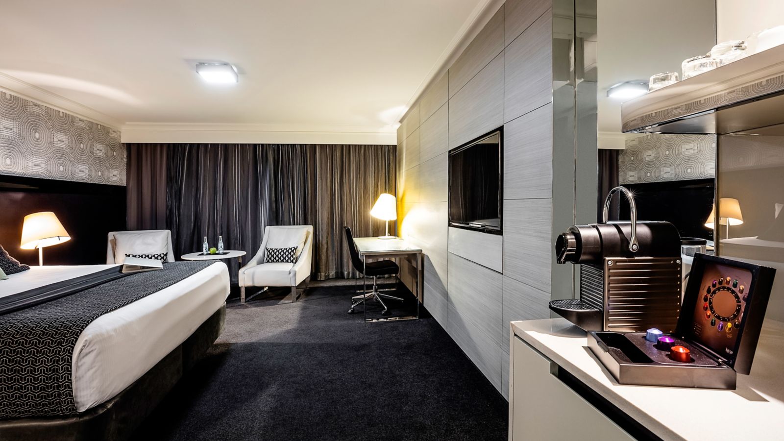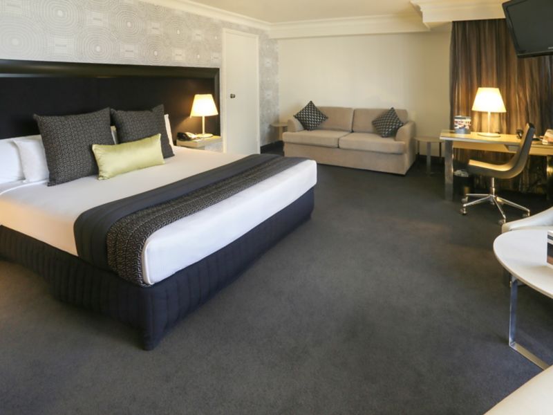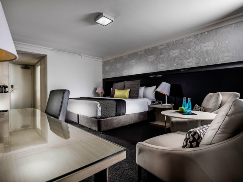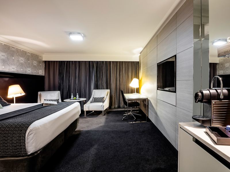 Generously sized rooms cleverly designed with a sleek & fashionable decor featuring timber wood panels unique wallpaper LCD TV generous workspace plush leather armchairs comfy sofa and indulgent King bed.