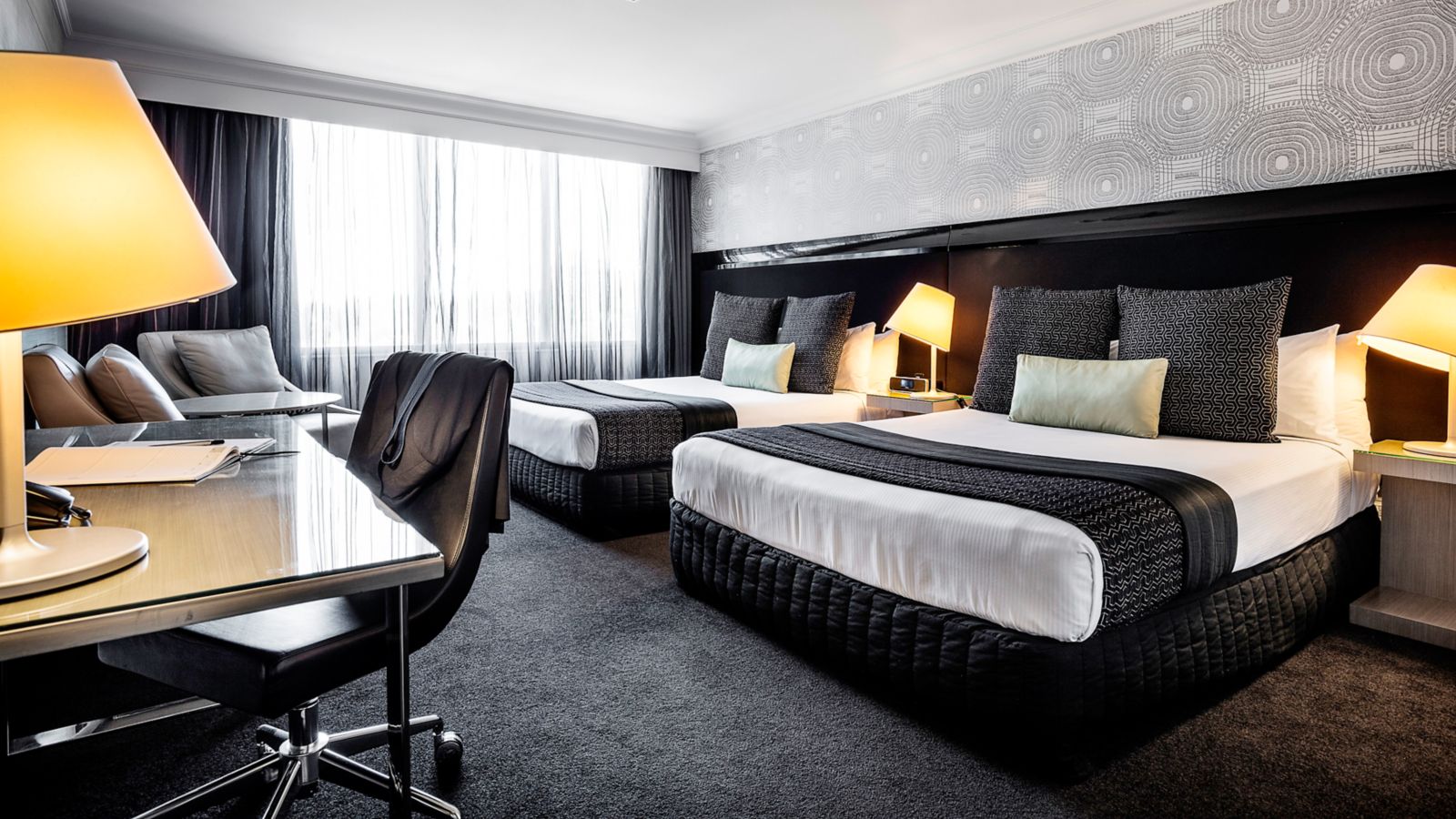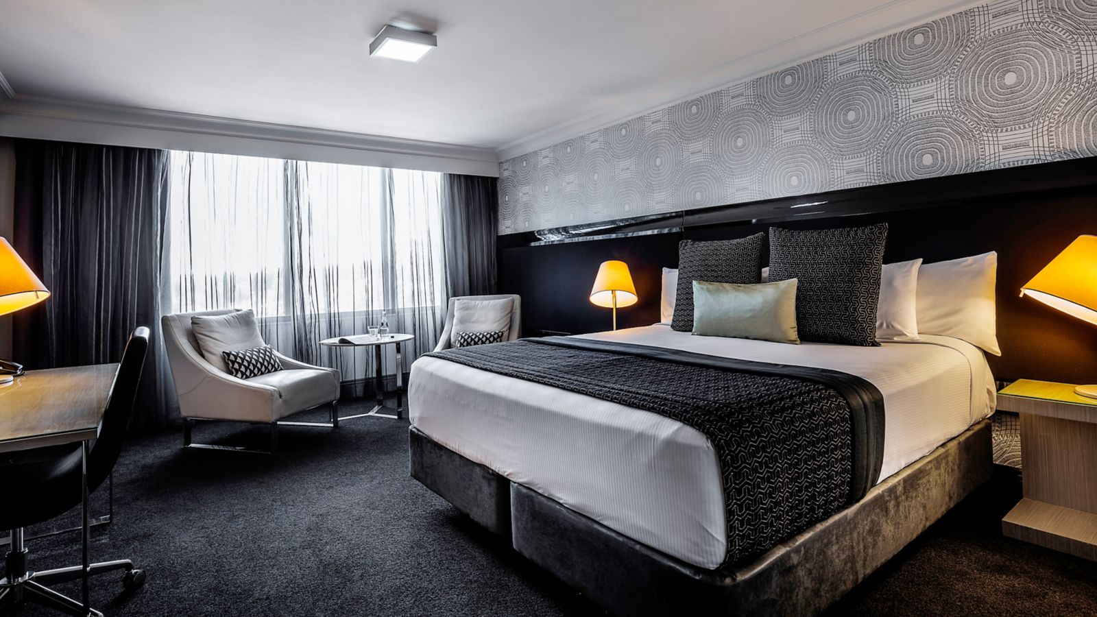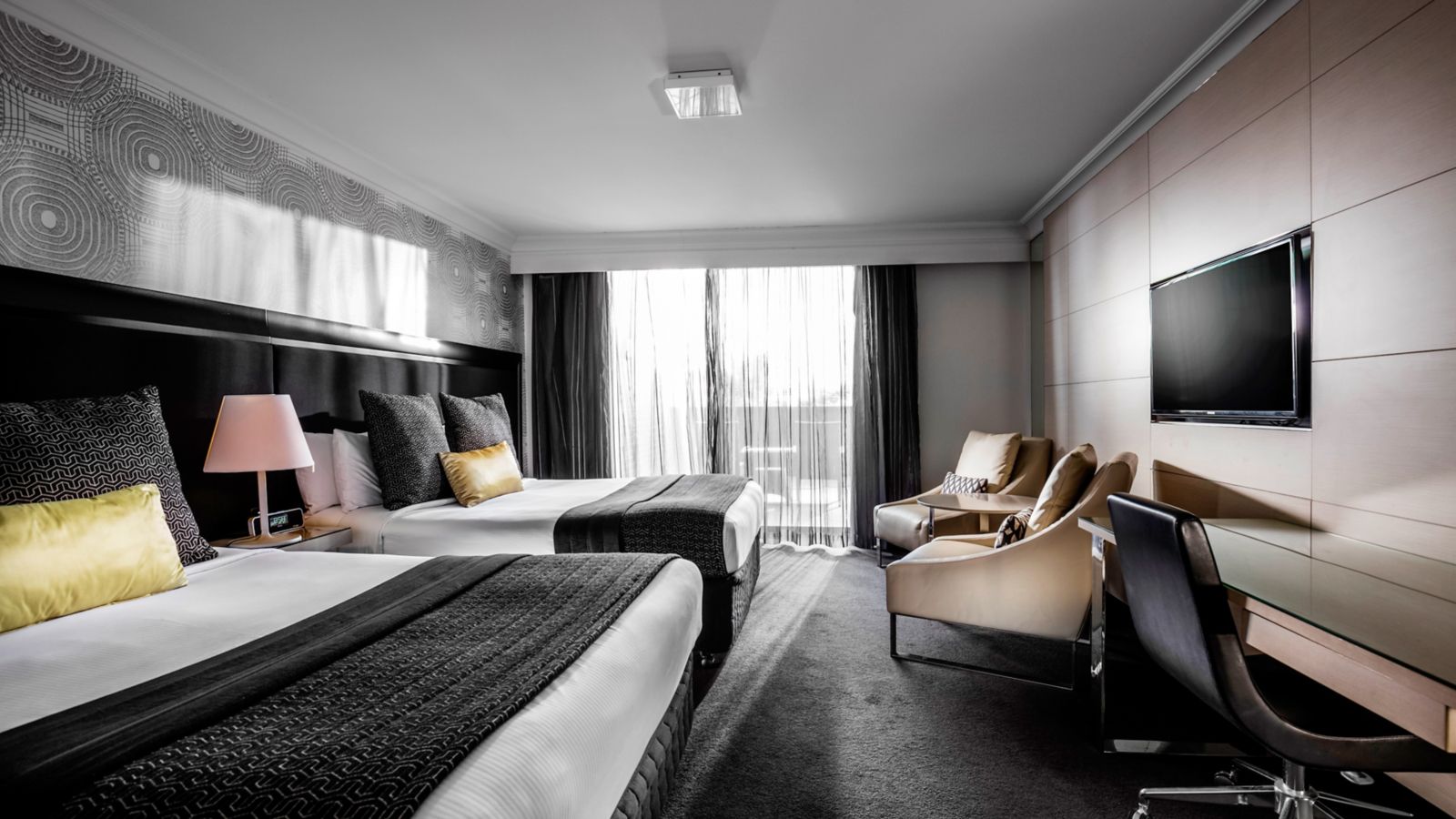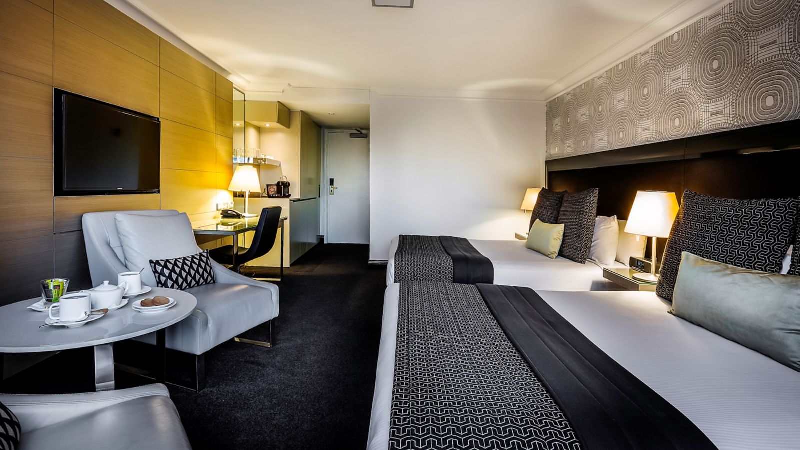 Generously sized rooms cleverly designed with a sleek & fashionable decor featuring timber wood panels unique wallpaper LCD TV generous workspace plush leather armchairs comfy sofa and indulgent King bed.