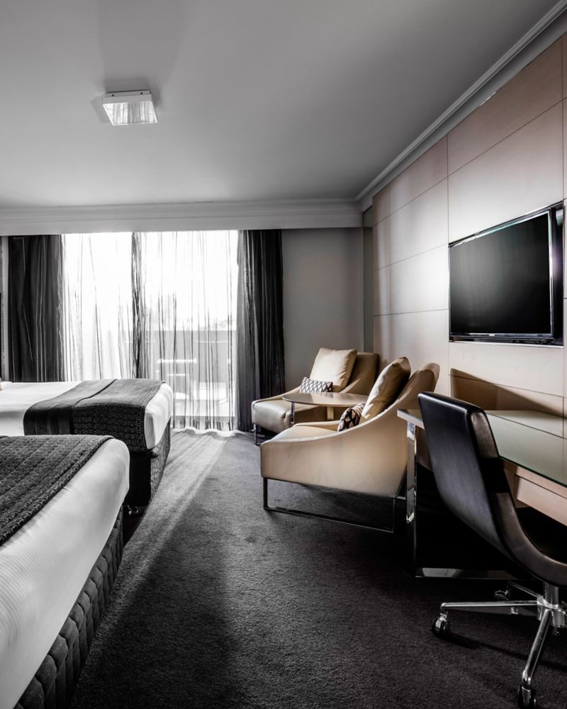 Generously sized rooms cleverly designed with a sleek & fashionable decor featuring timber wood panels unique wallpaper LCD TV generous workspace plush leather armchairs comfy sofa and indulgent King bed.