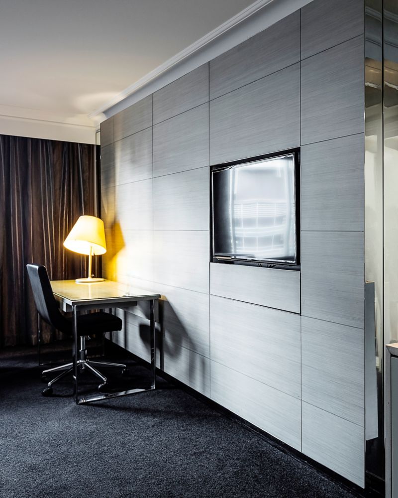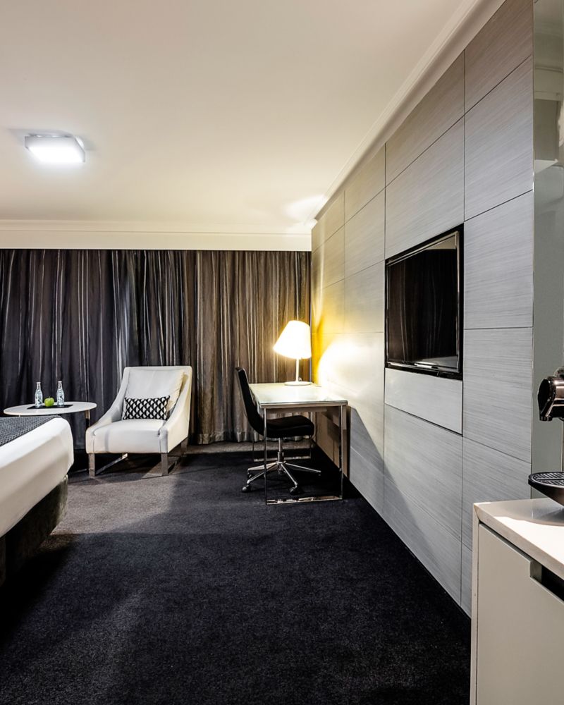 Spacious and modern featuring a king bed marble finished ensuite with bath shower and dual basins. Rooms feature LCD TV with Cable separate work desk wireless and cabled internet fee steam irons ironing boards and bathrobes slippers