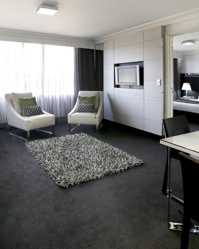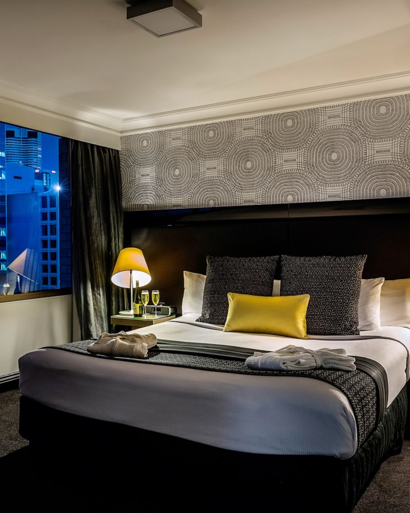 Spacious and modern featuring a king bed marble finished ensuite with bath shower and dual basins. Rooms feature LCD TV with Cable separate work desk wireless and cabled internet fee steam irons ironing boards and bathrobes slippers