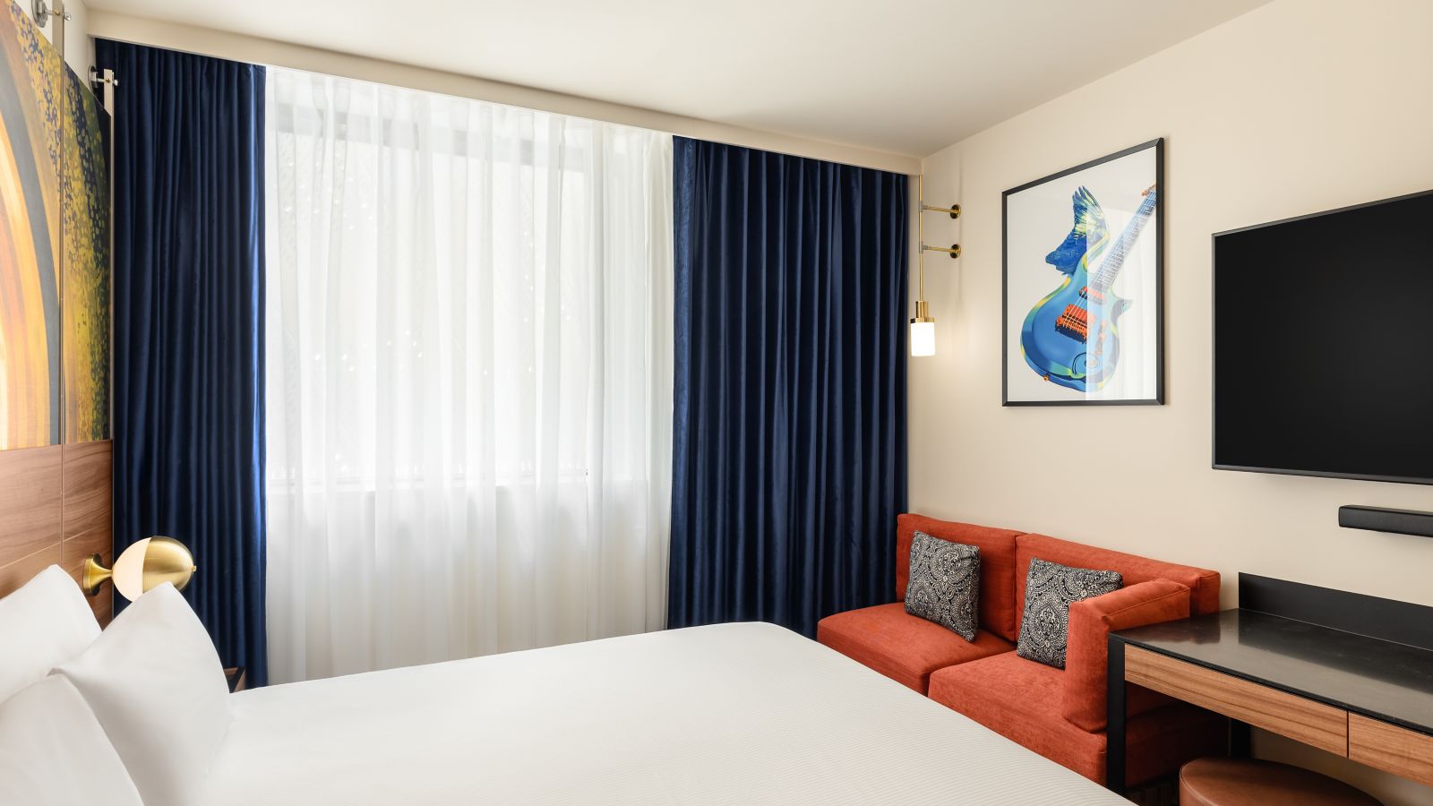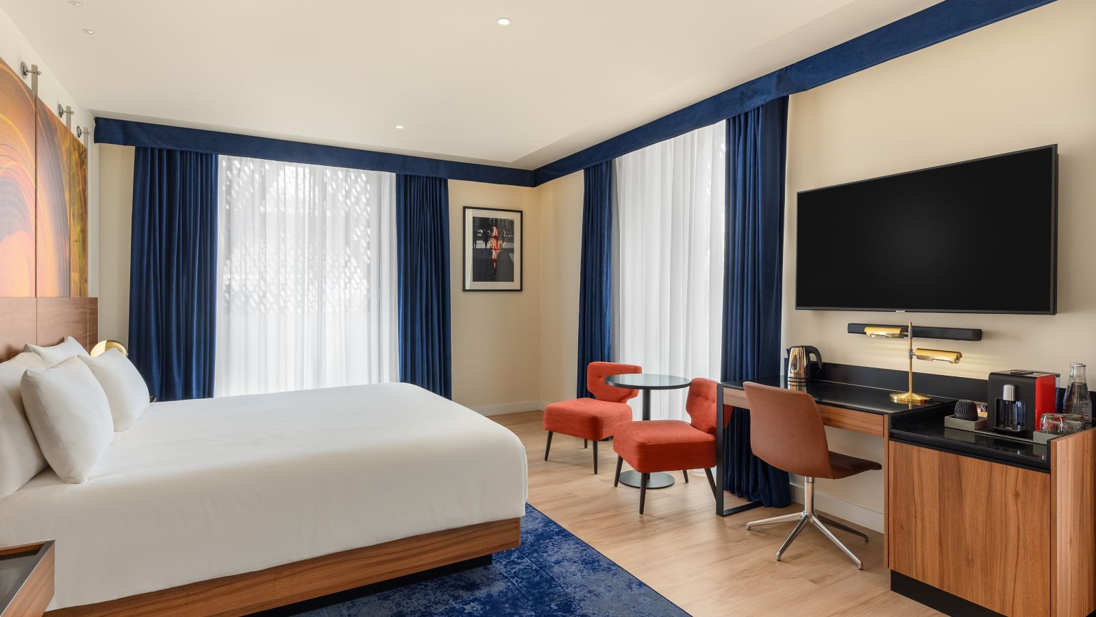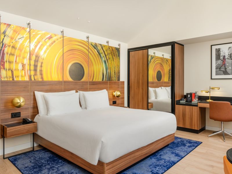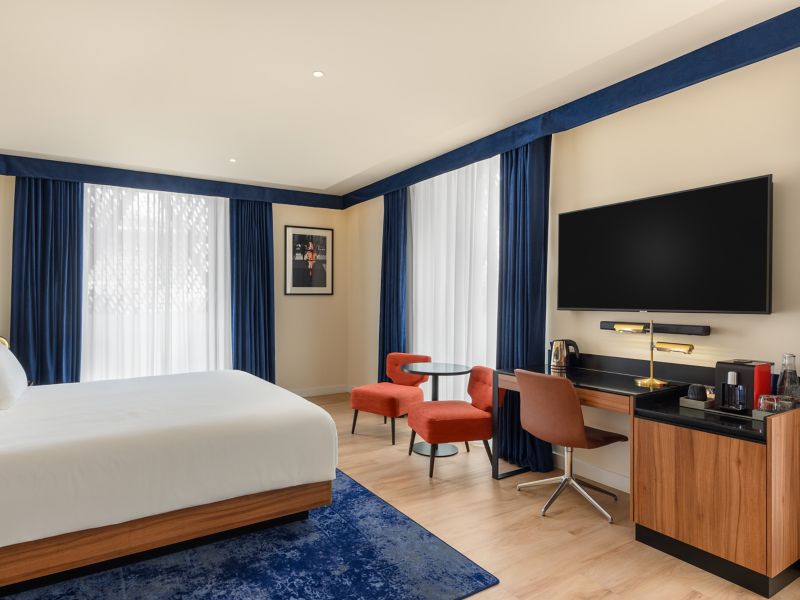Stylish Deluxe room with one super king size double bed (200x200 cm), en-suite bathroom, Chromecast TV, coffee and tea making facilities, high quality amenities.