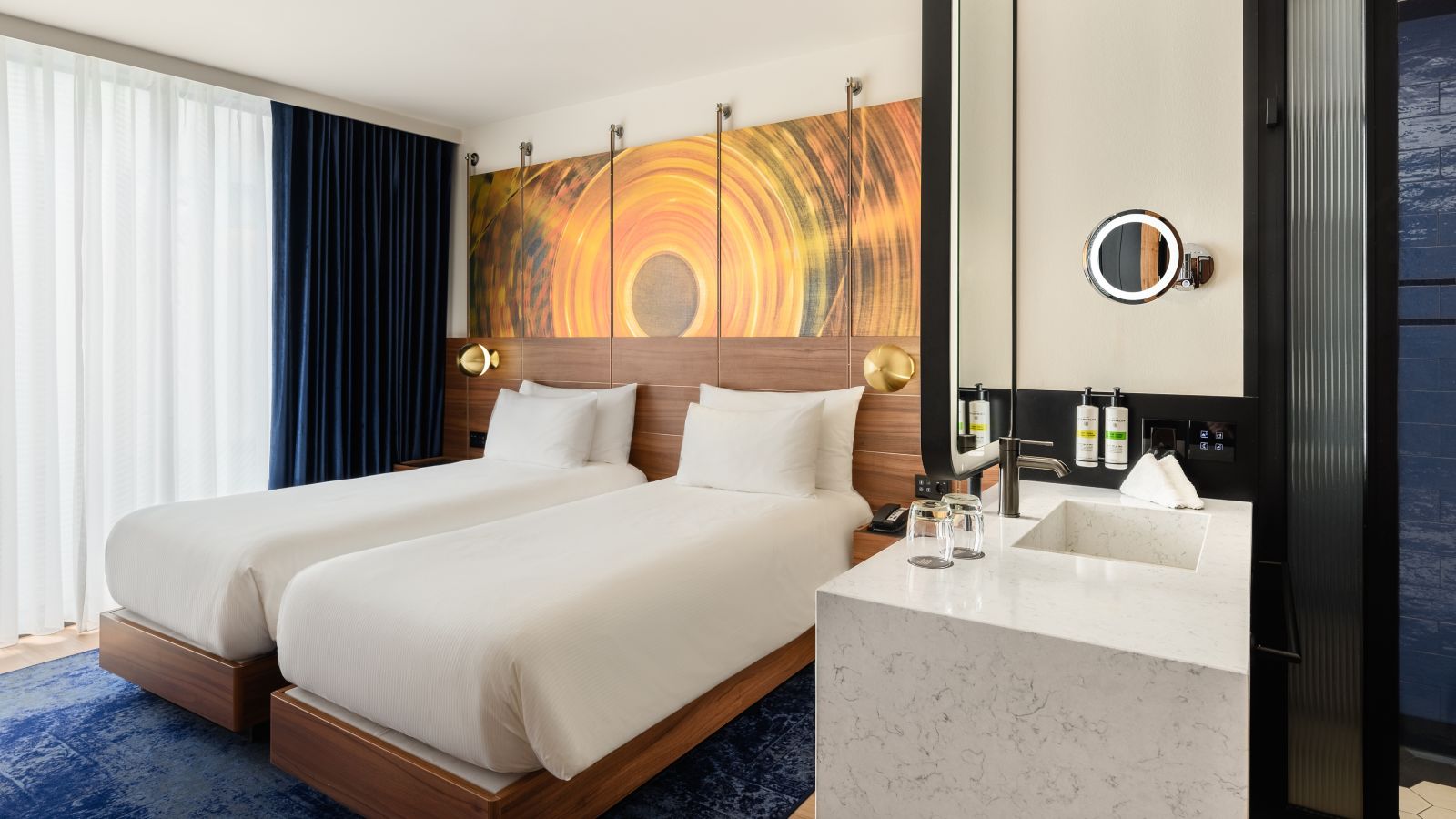 Stylish Deluxe room with two single beds (200x100 cm), en-suite bathroom, Chromecast TV, coffee and tea making facilities, high quality amenities.