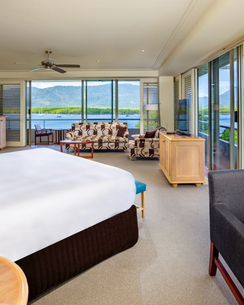 Appointed for comfort in warm, natural hues and all the modern conveniences you need. Our Superior king rooms are spaciously appointed with king bed, single spa bath and private garden balcony overlooking Cairns city.