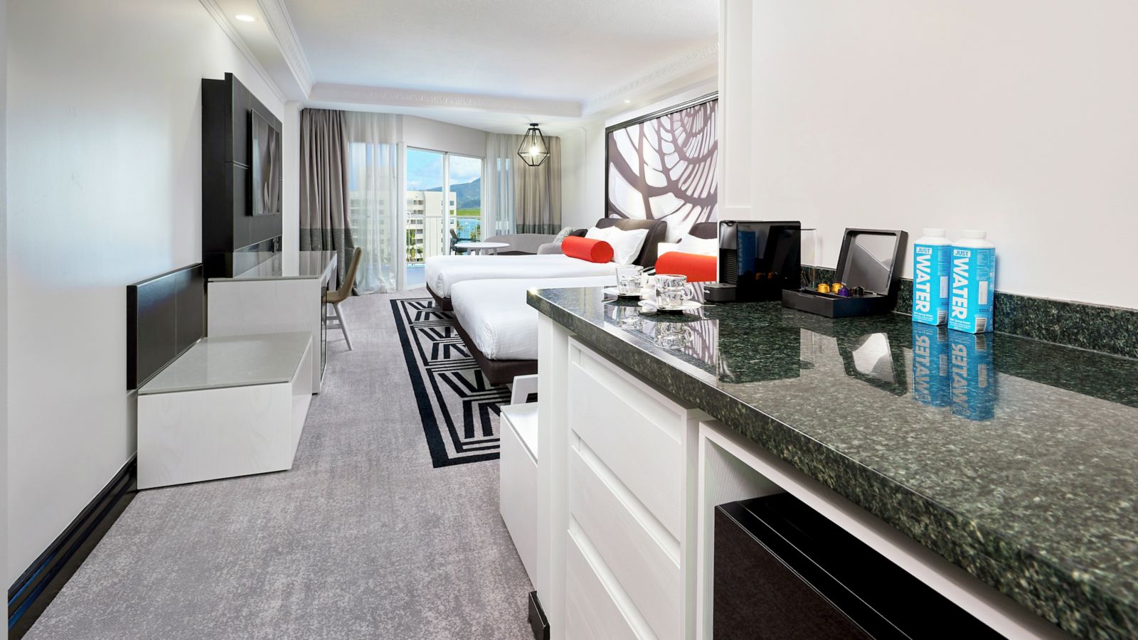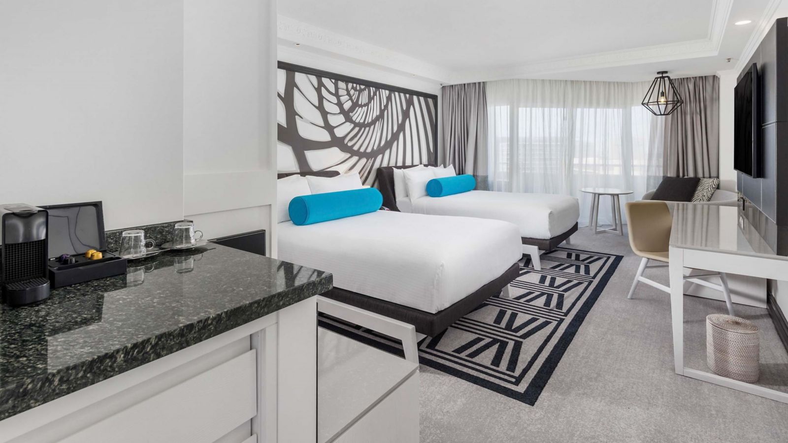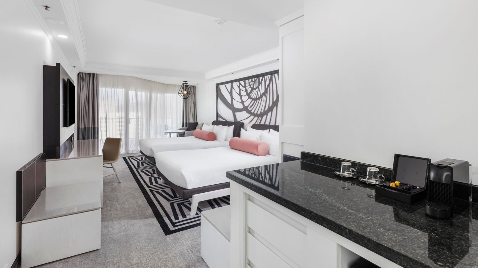 Experience a rejuvenated hotel room complimenting contemporary luxury and architectural grandeur. This hotel room has a private balcony- two long double beds- ensuite bathroom with lux amenities- 50 inch TV-Nespresso machine- mini bar and comp Wifi.