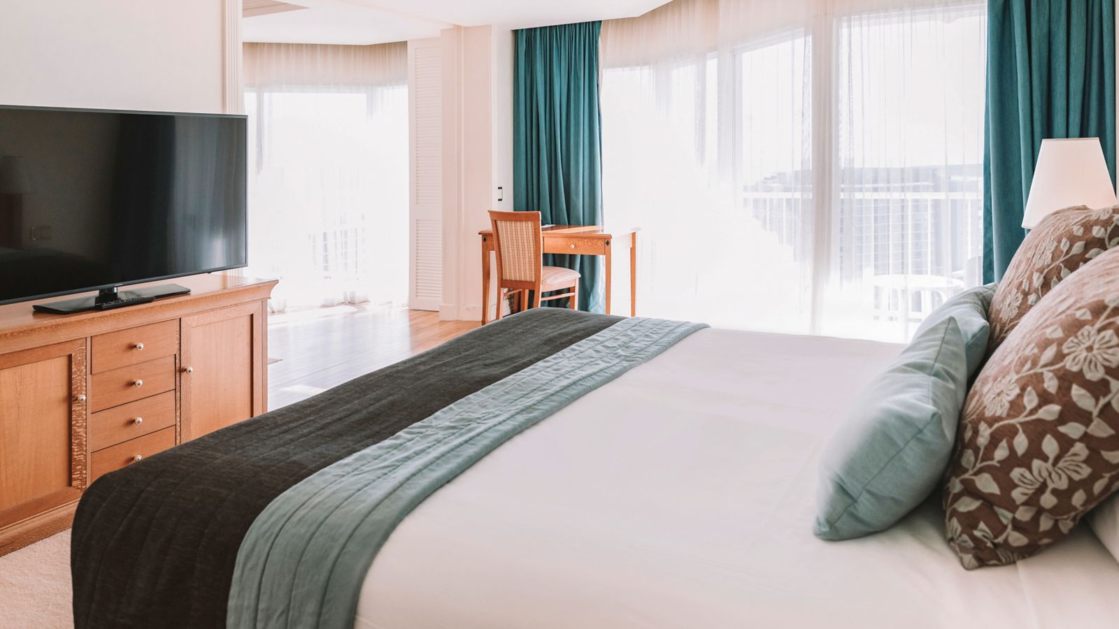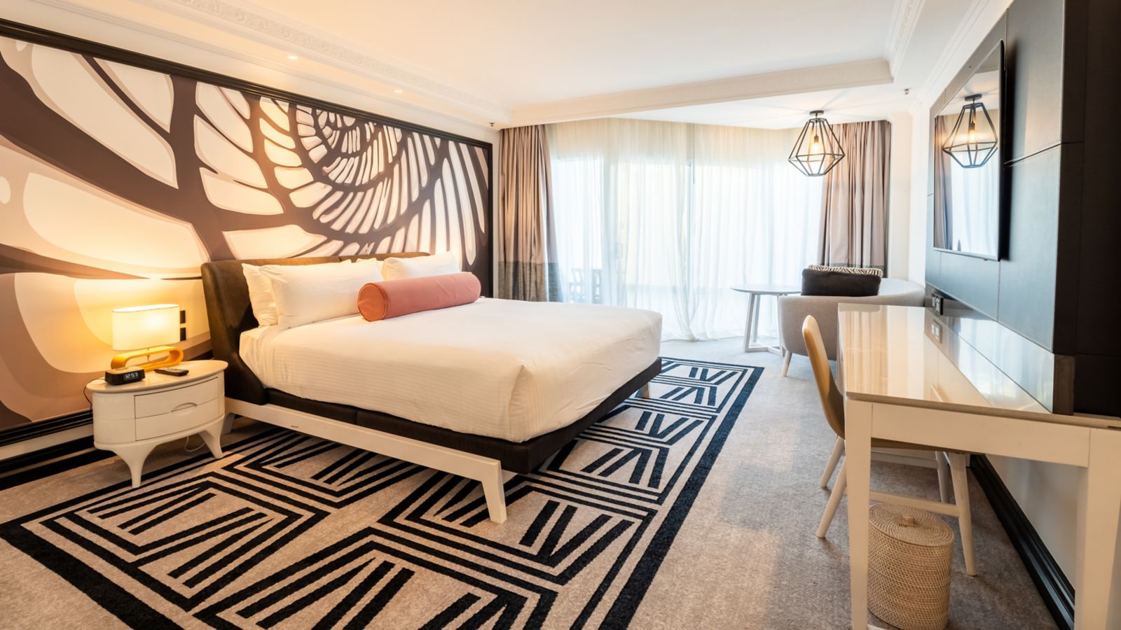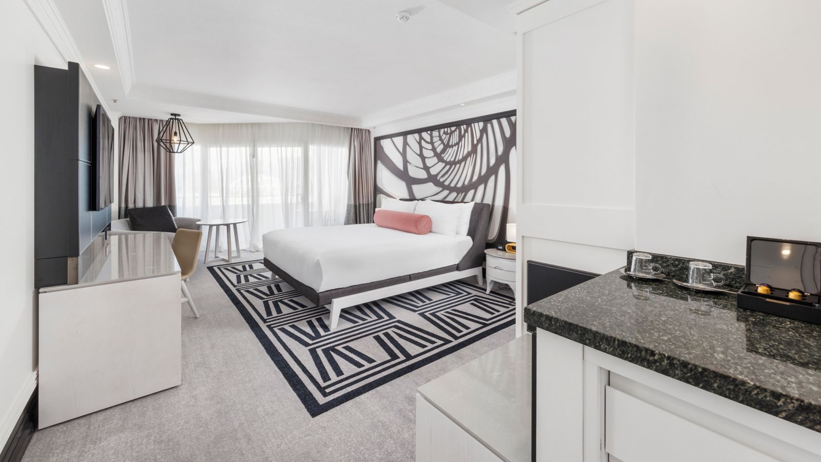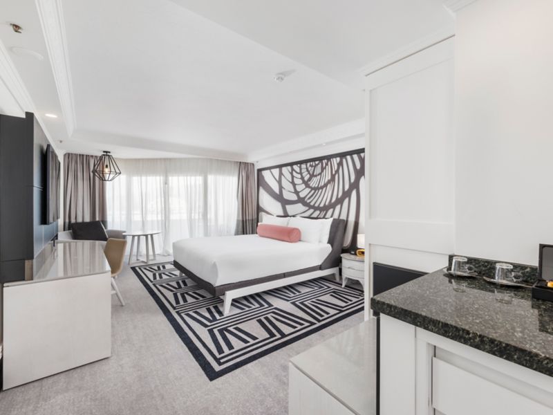 Experience a rejuvenated hotel room complimenting contemporary luxury and architectural grandeur. This hotel room has a private balcony- two long double beds- ensuite bathroom with lux amenities- 50 inch TV-Nespresso machine- mini bar and comp Wifi.