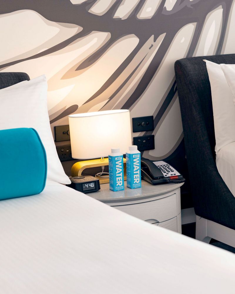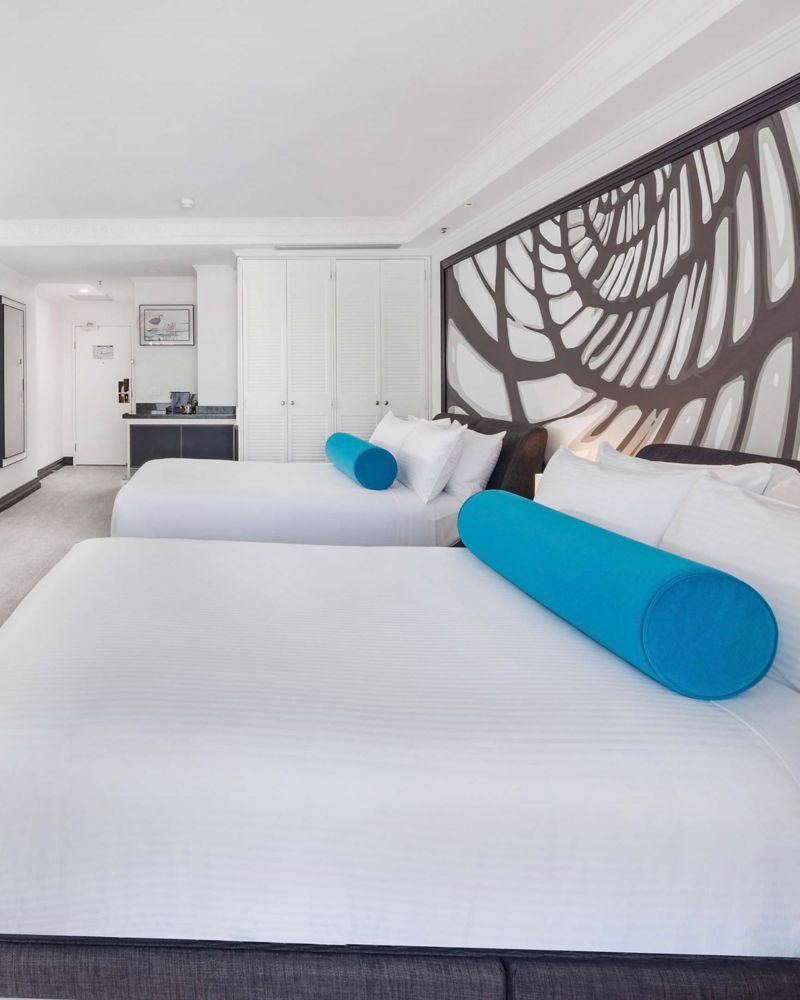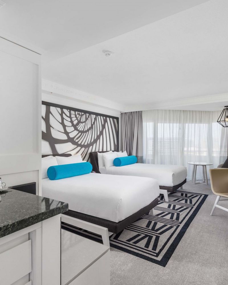 Experience a rejuvenated hotel room complimenting contemporary luxury and architectural grandeur. This hotel room has a private balcony- two long double beds- ensuite bathroom with lux amenities- 50 inch TV-Nespresso machine- mini bar and comp Wifi.