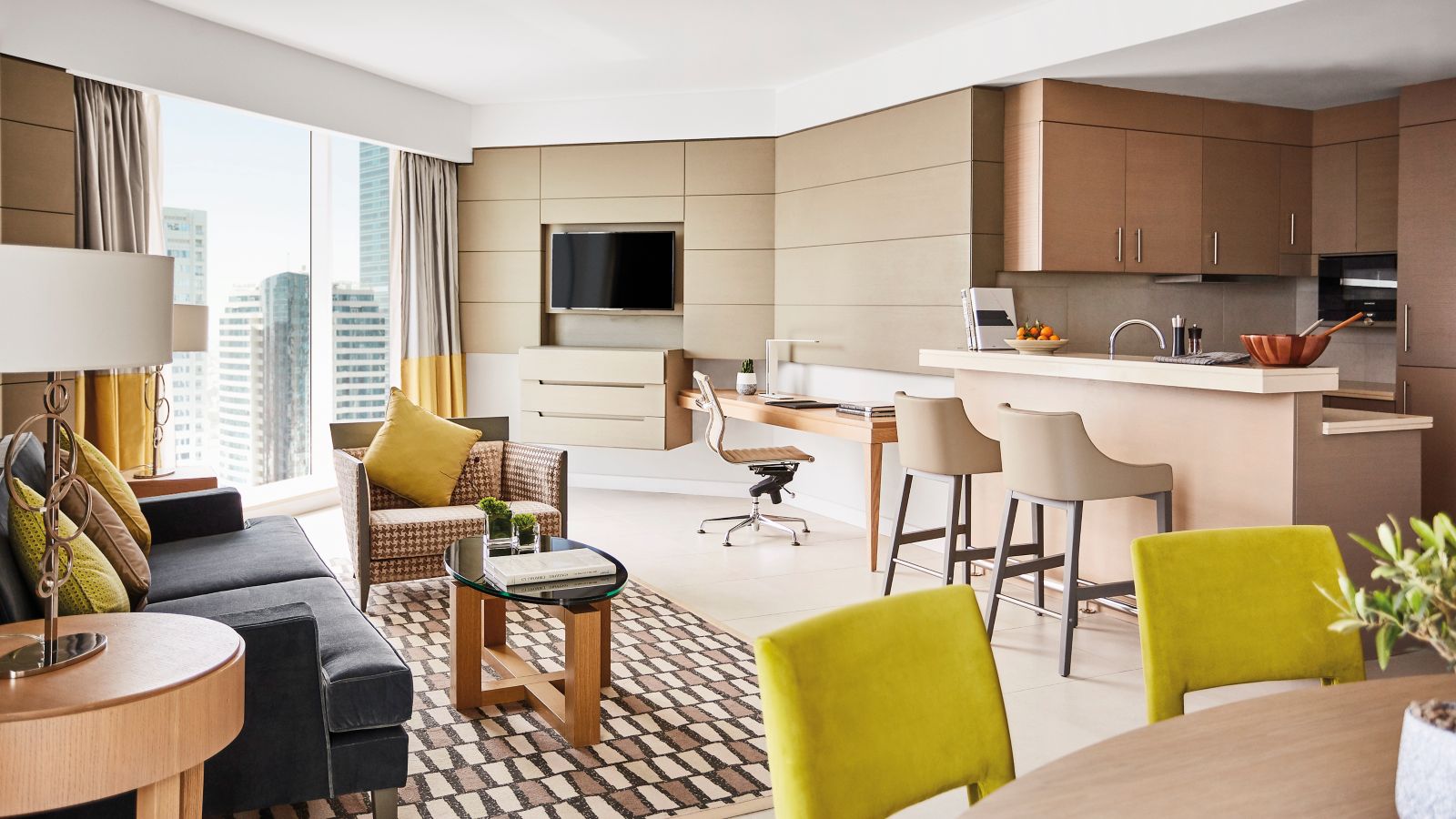 From 90-92m², our one bedroom apartment offers a king-size bed, living & dining area, a kitchen, bathroom with C.O Bigelow amenities, WiFi, two 40'' TVs, Chromecast, 24-hr room service, in-room safe, large workstation ideal for short & long stays.