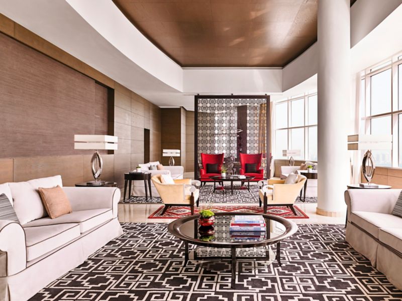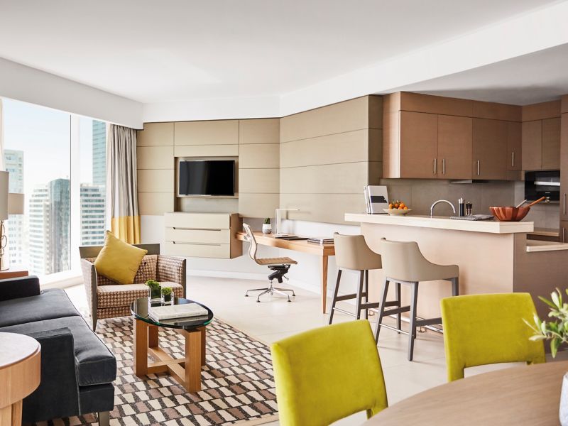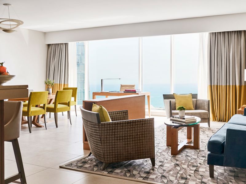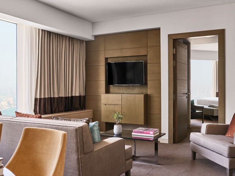 From 270-350m², our state-of-the-art Pullman Penthouse exudes a large Majlis, 2 master bedrooms, C.O. Bigelow amenities in each bathroom, vast dressing areas, furnished living and dining area, equipped kitchen, jacuzzi, and executive lounge access.