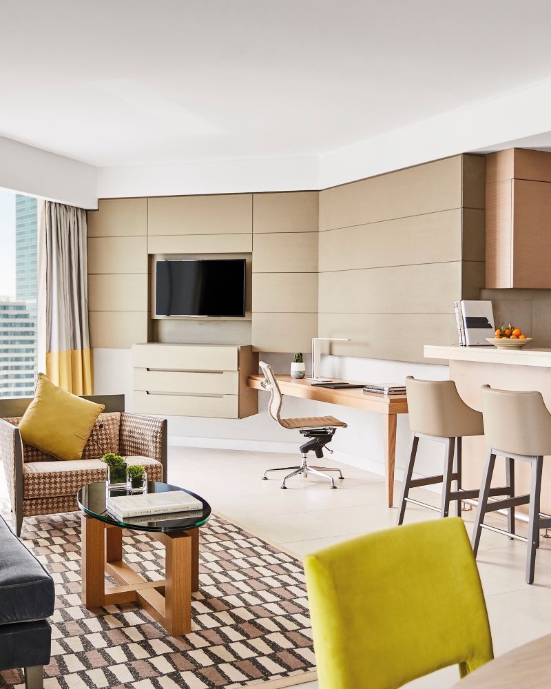 From 70 m², this suite offers a separate bedroom, stylish dining and living area, executive lounge access, WiFi, 40'' TV, Chromecast, in-room safe, 24-hr room service, bathroom with walk-in shower and tub, C.O Bigelow amenities, Nespresso and tea-maker.