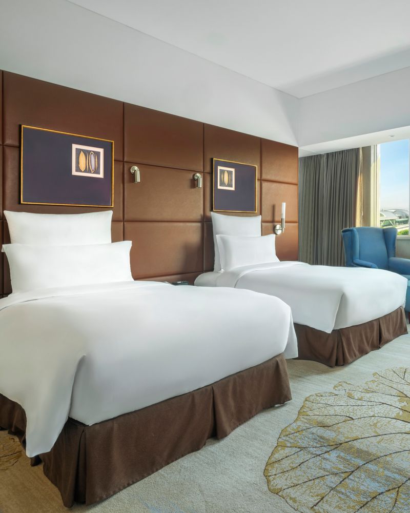 Our Deluxe Room, with two single beds and an airport view, offers a refreshing haven for both rest and soft comfort. Enjoy 23 sqm (248 sqft) of space designed with thoughtful amenities and intuitive technologies, perfect for a meaningful pause.