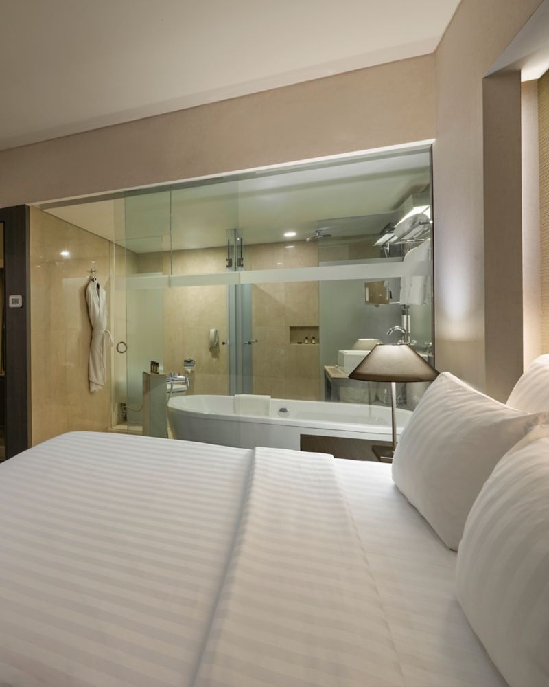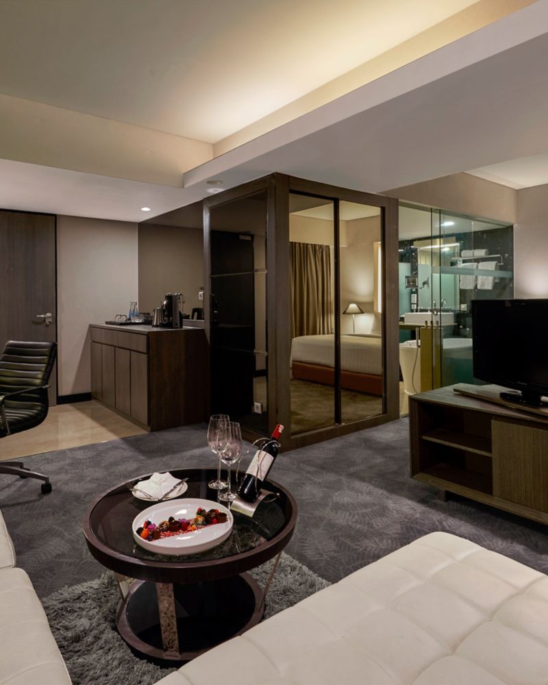 Modern 39 m² room in Jarkata's CBD featuring sofa lounge and ergonomic work desk. Enjoy an elegant raised bath and separate tranquil rain shower. Complimentary WiFi internet.