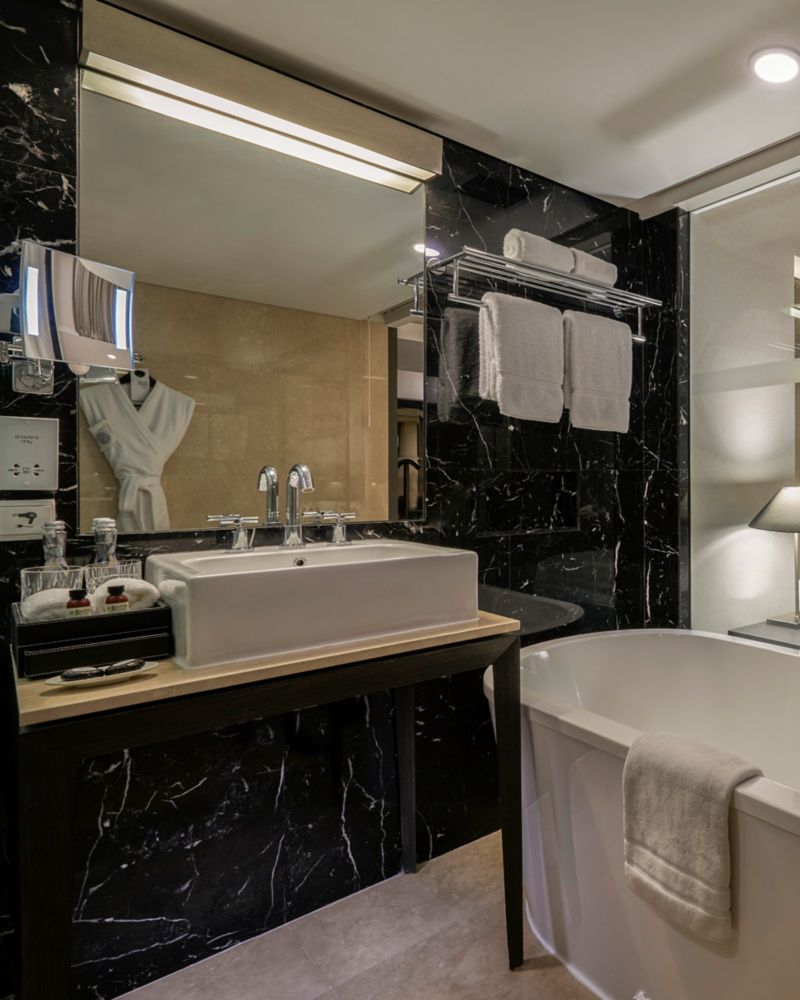 Step into the Deluxe Room, a 39 sqm (420 sqft) with a king bed. This room blends contemporary design with thoughtful amenities like a raised bath and ergonomic study desk, perfect for relaxation and staying creative.