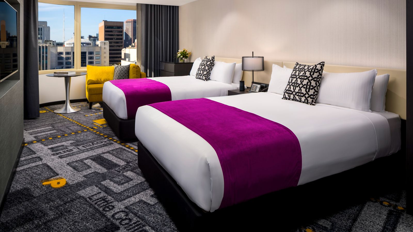 36sqm Superior Twin Rooms offer two luxurious Queen beds, and feature a relaxed workspace, 55" Smart TV with FOXTEL Business, rainfall shower, GHD straightener, Nespresso machine, mini-bar, BOSE sound, ASPAR bathroom amenities and complimentary WIFI.