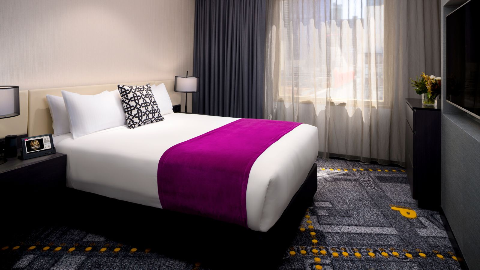 Stylish room with Queen bed, accessible bathroom, 55" Smart TV FOXTEL Business, BOSE sound, WiFi, GHD straightener, Nespresso machine, mini-bar and rainfall shower. Please note: This room type cannot be upgraded due to its specific features