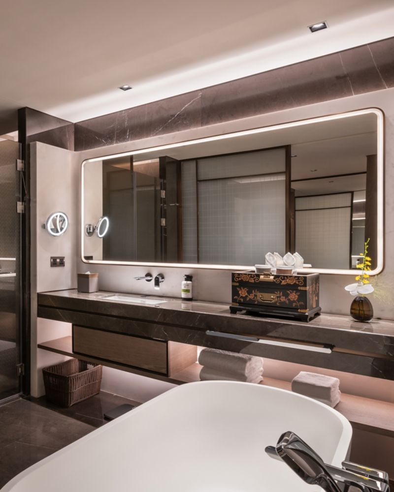落地窗,46-51㎡,2米大床,免费上网,65寸电视,宽敞的办公桌,迷你吧,恒温热带雨林淋浴系统和浴缸,智能马桶,浴袍和拖鞋,熨斗,熨衣板