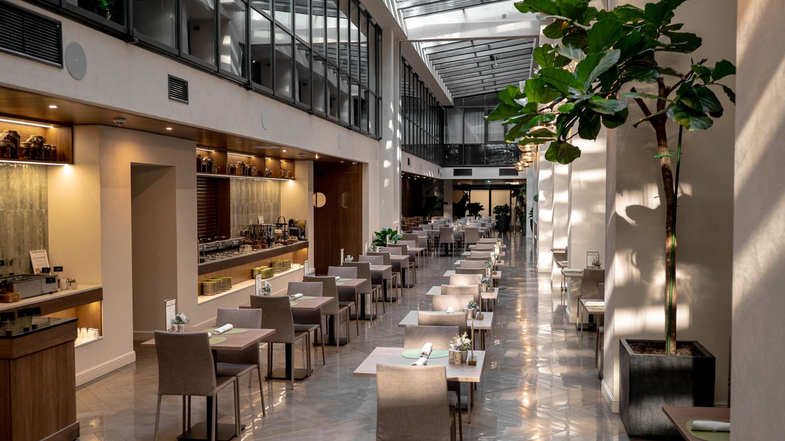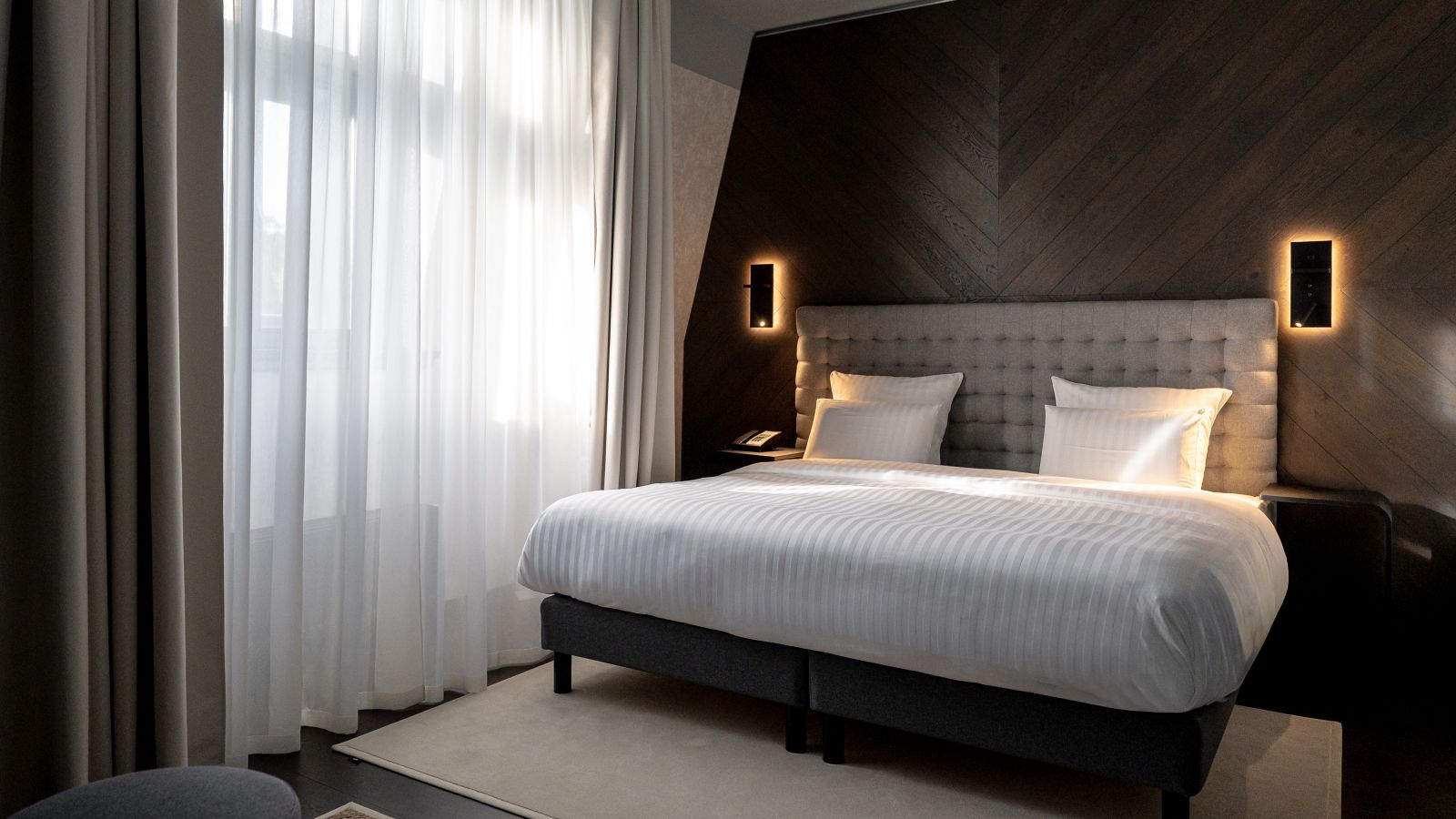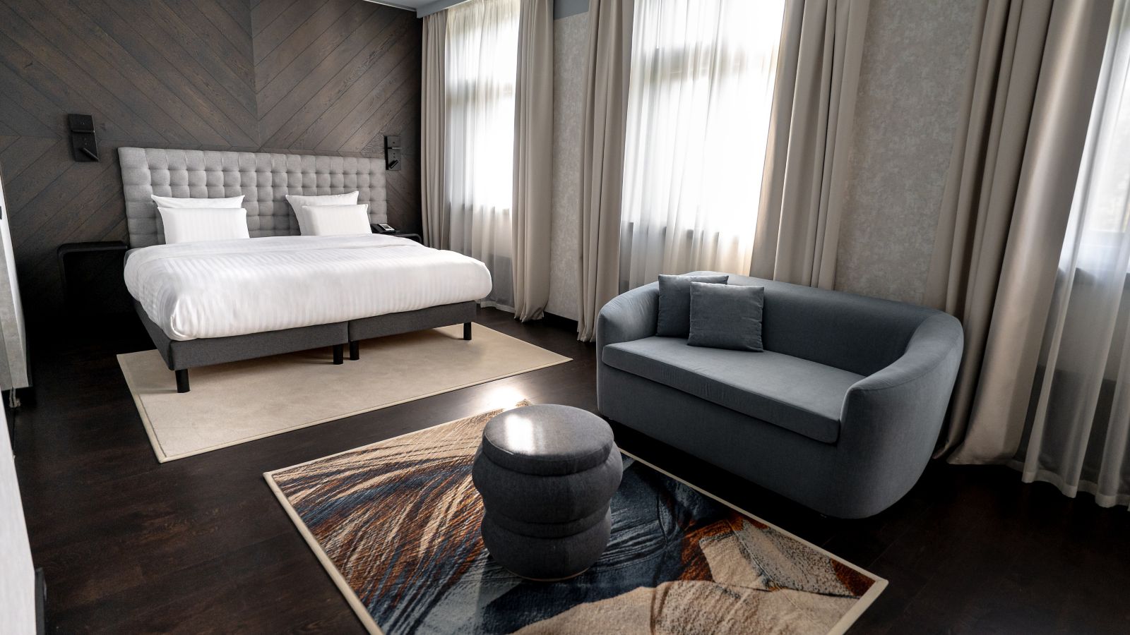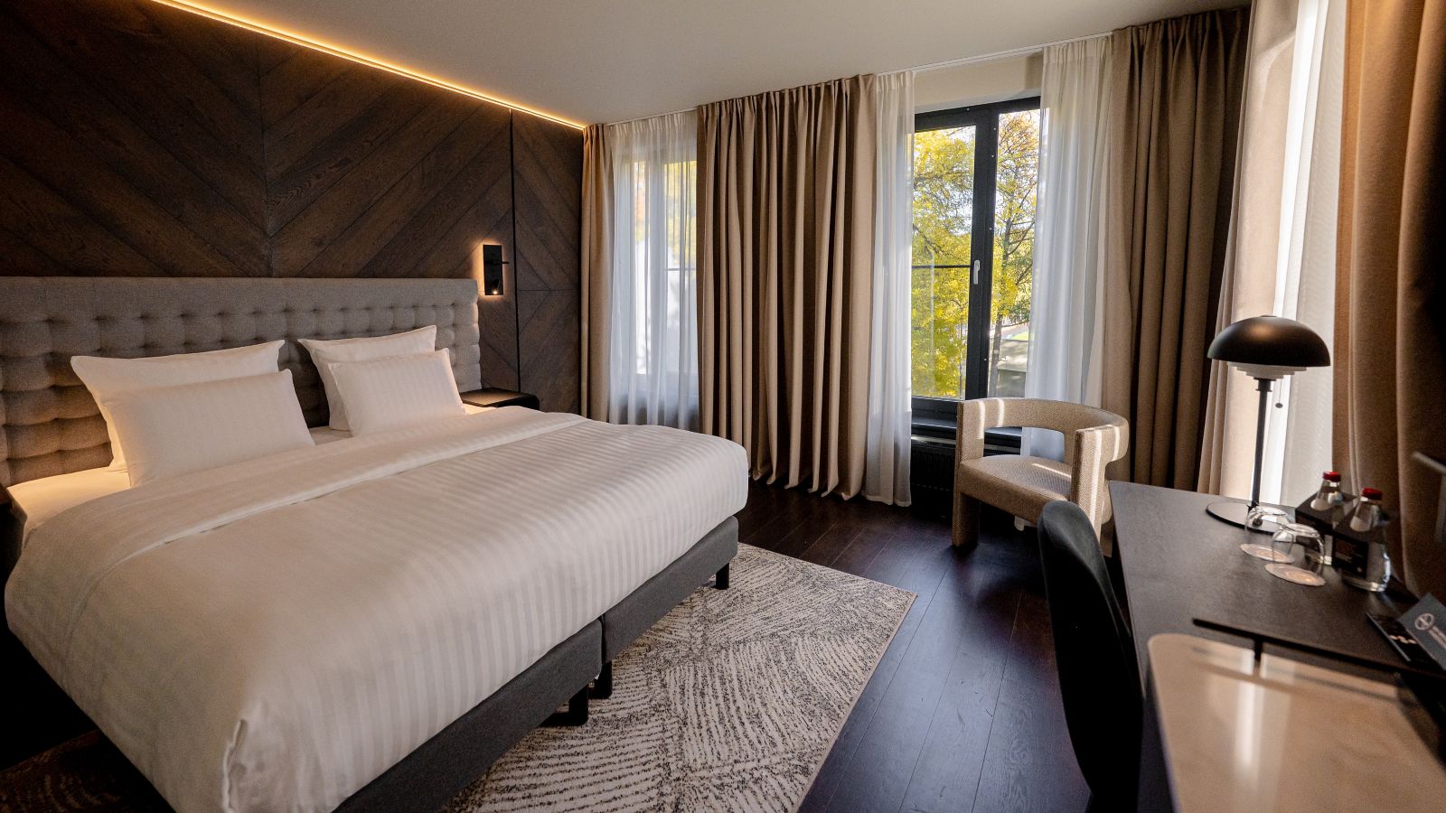 Deluxe Rooms are minimum 31 m² spacious and feature atrium views, a large window, comfortable Pullman bed, free Internet, 55 in LED SMART TV, voicemail, safe, desk, kettle, minibar and rain shower.