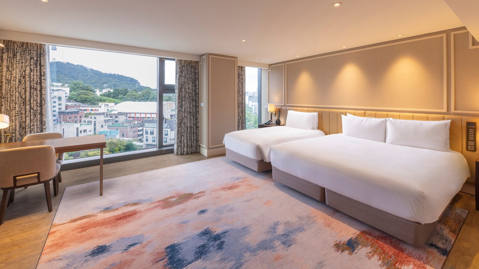 Size of 40m² Room with 1 King bed and 1 Single bed. Features modern luxurious interior and offers N Seoul Tower view. 65' Smart TV, IoT Service, Mini Bar, Coffee Machine, Wireless Charger, Bluetooth Speaker, Bathtub and Rain Shower.